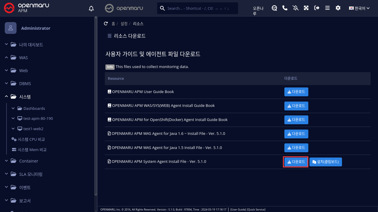 APM 에이전트 설치가이드시스템 에이전트 설치이 페이지에서시스템 에이전트 설치 시스템 에이전트 다운로드 클라우드 전용 Cloud APM > 에이전트 설치 안내 > SYS AGENT 탭