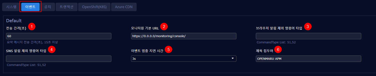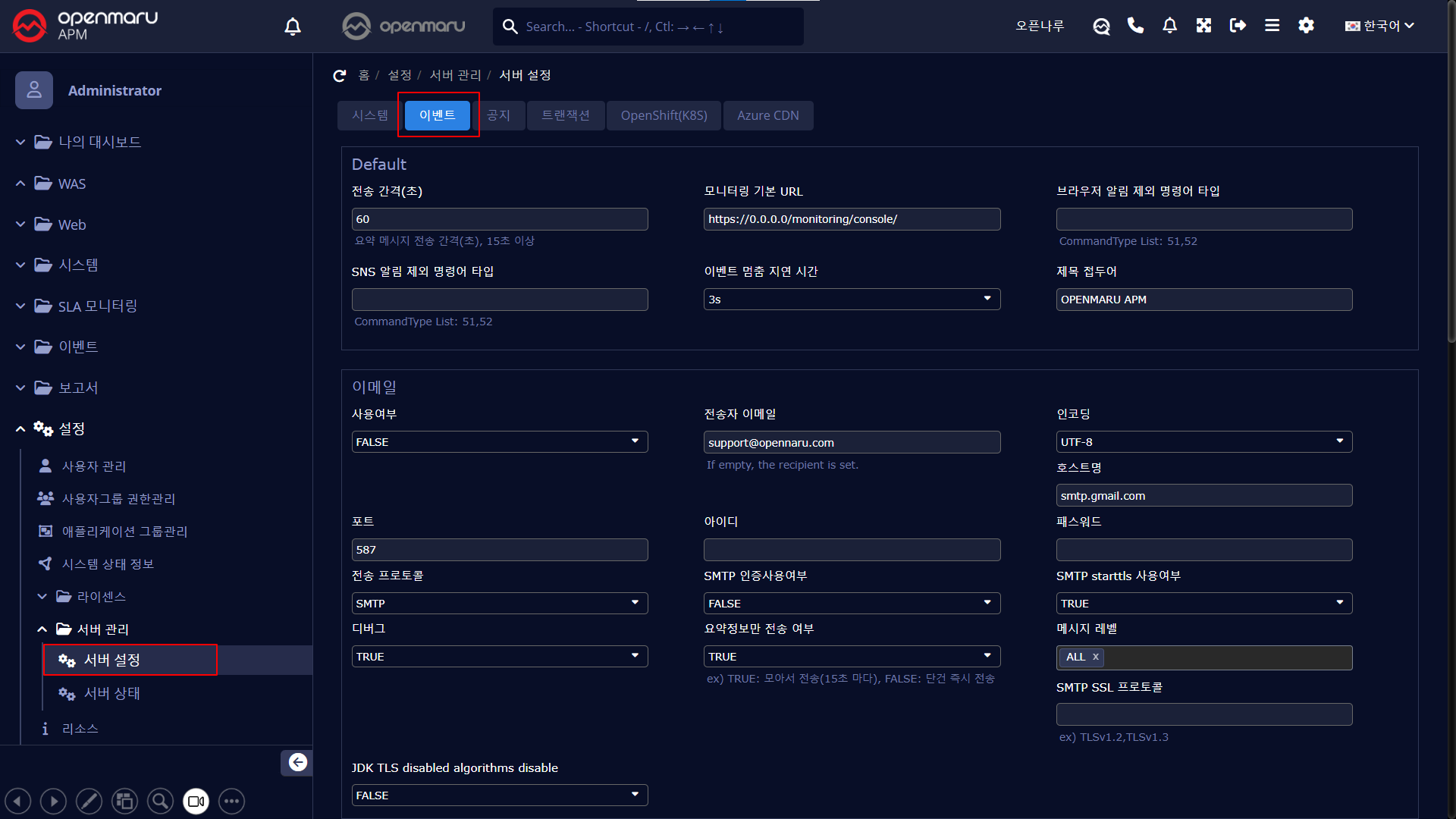 OPENMARU APM 에 접속하여 좌측 메뉴의 설정 - 서버 관리 - 서버 설정 - 이벤트 메뉴를 선택하면 Default (기본) 이벤트 설정을 할 수 있다.