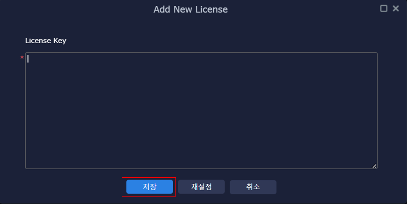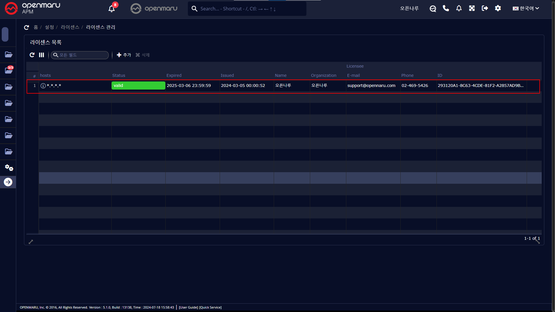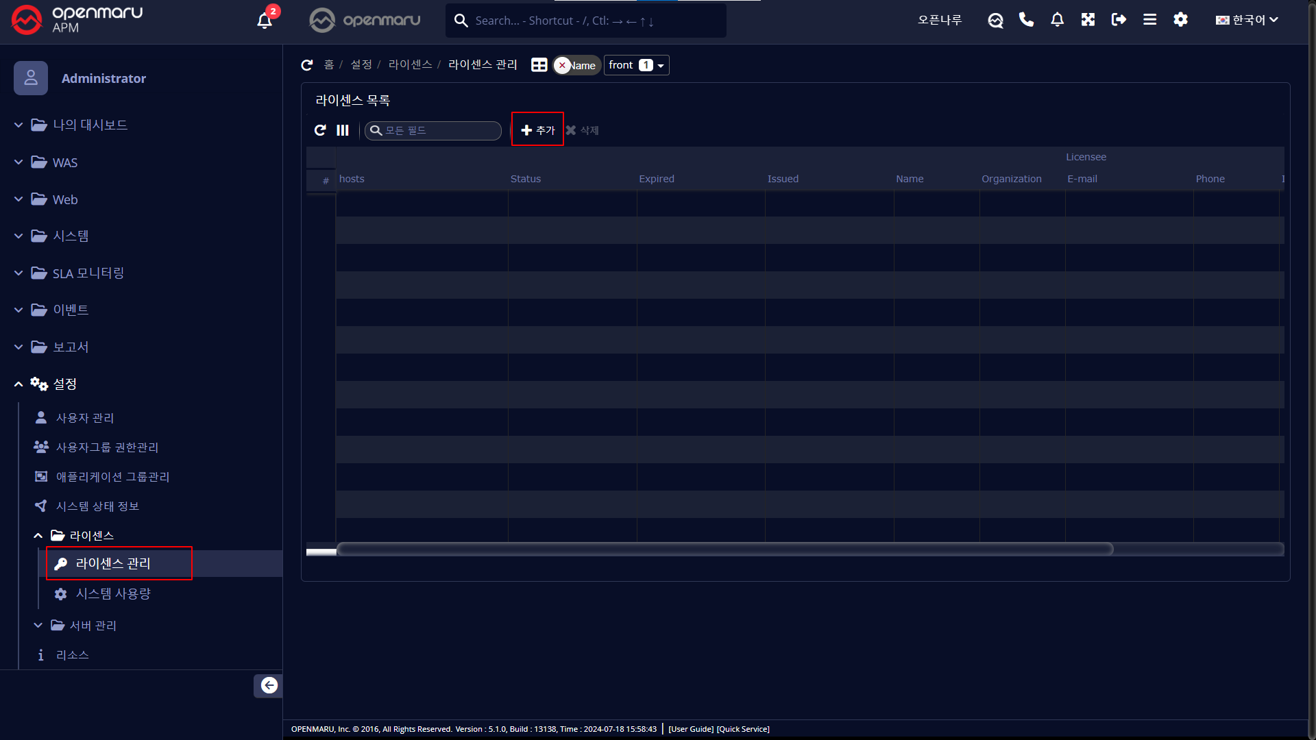 APM 사용자 가이드시스템 설정가이드라이센스 관리이 페이지에서라이센스 관리 APM 라이선스 입력 좌측 메뉴의 ‘설정’ ‘라이선스 관리’를 선택하면 다음과 같이 OPENMARU APM의 라이선스를 관리할 수 있다. 발급받은 라이선스를 입력하려면, ‘Add New’ 버튼을 클릭한다. 라이선스 입력창에 발급받은 라이선스를 입력한 후, ‘저장(Save)’ 버튼을 클릭한다. 다음과 같이 발급받은 라이선스가 서버에 입력되었다.