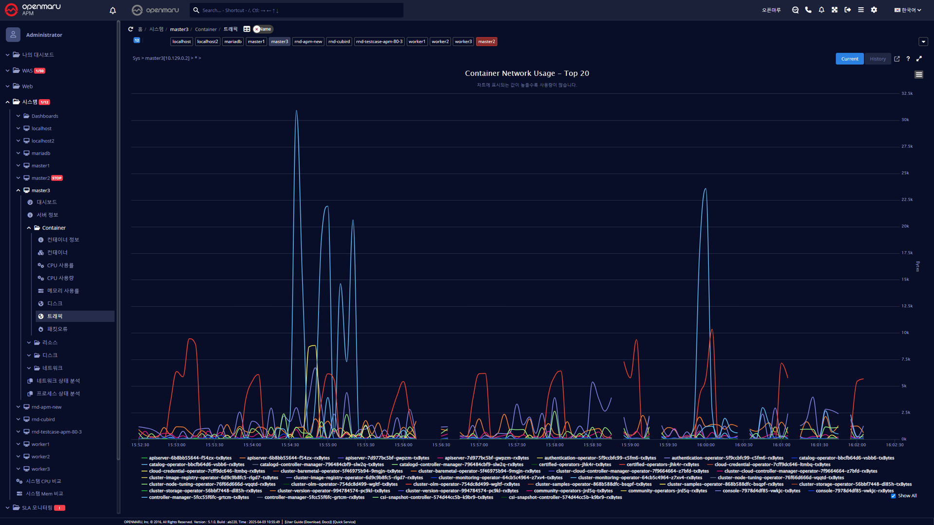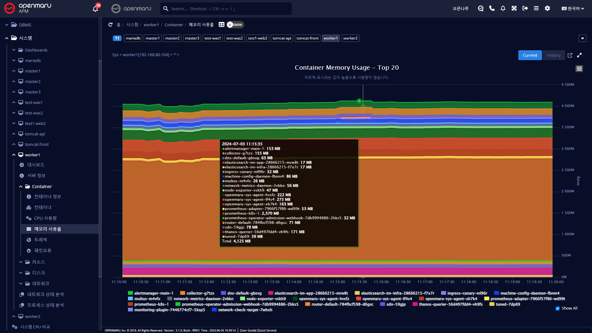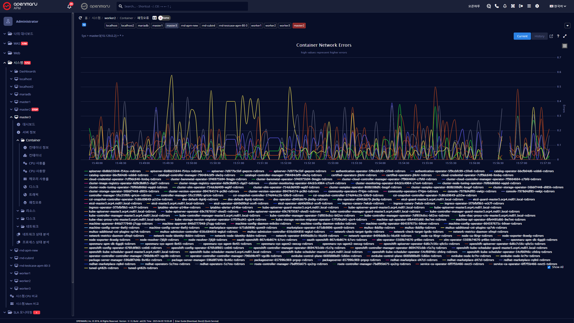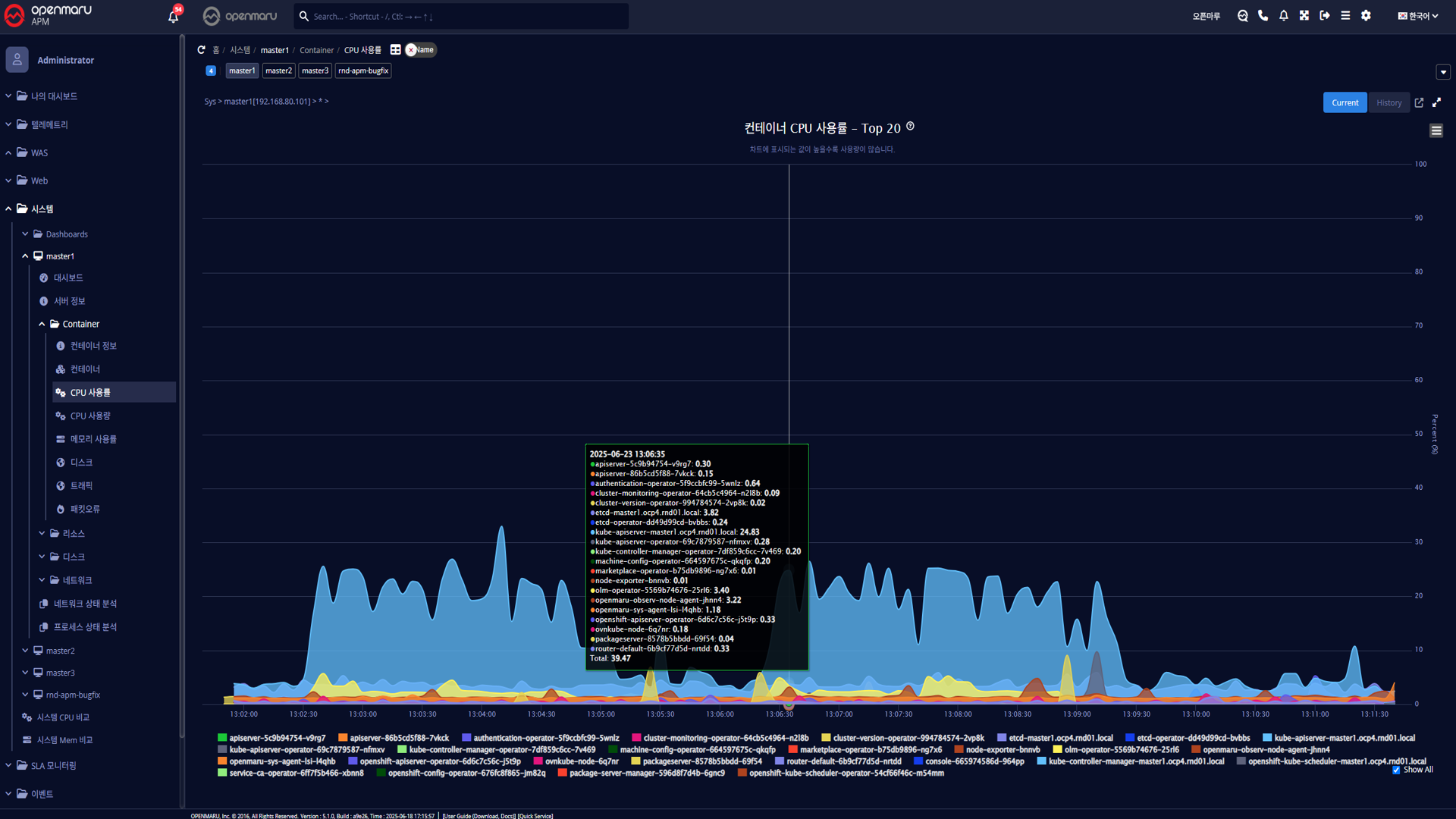 시스템의 CPU 사용률을 컨테이너로 구분하여 그래프로 표시한다.