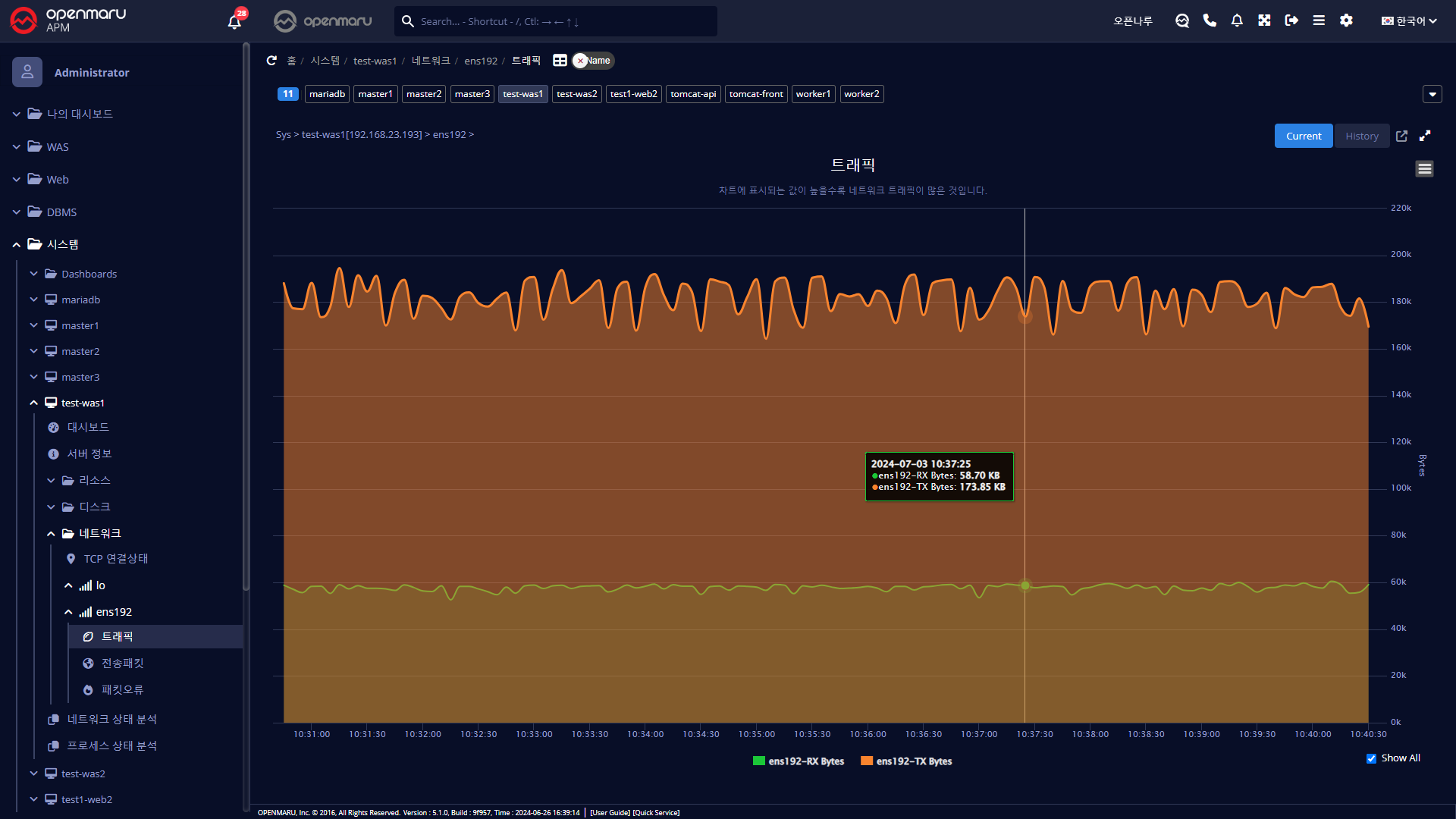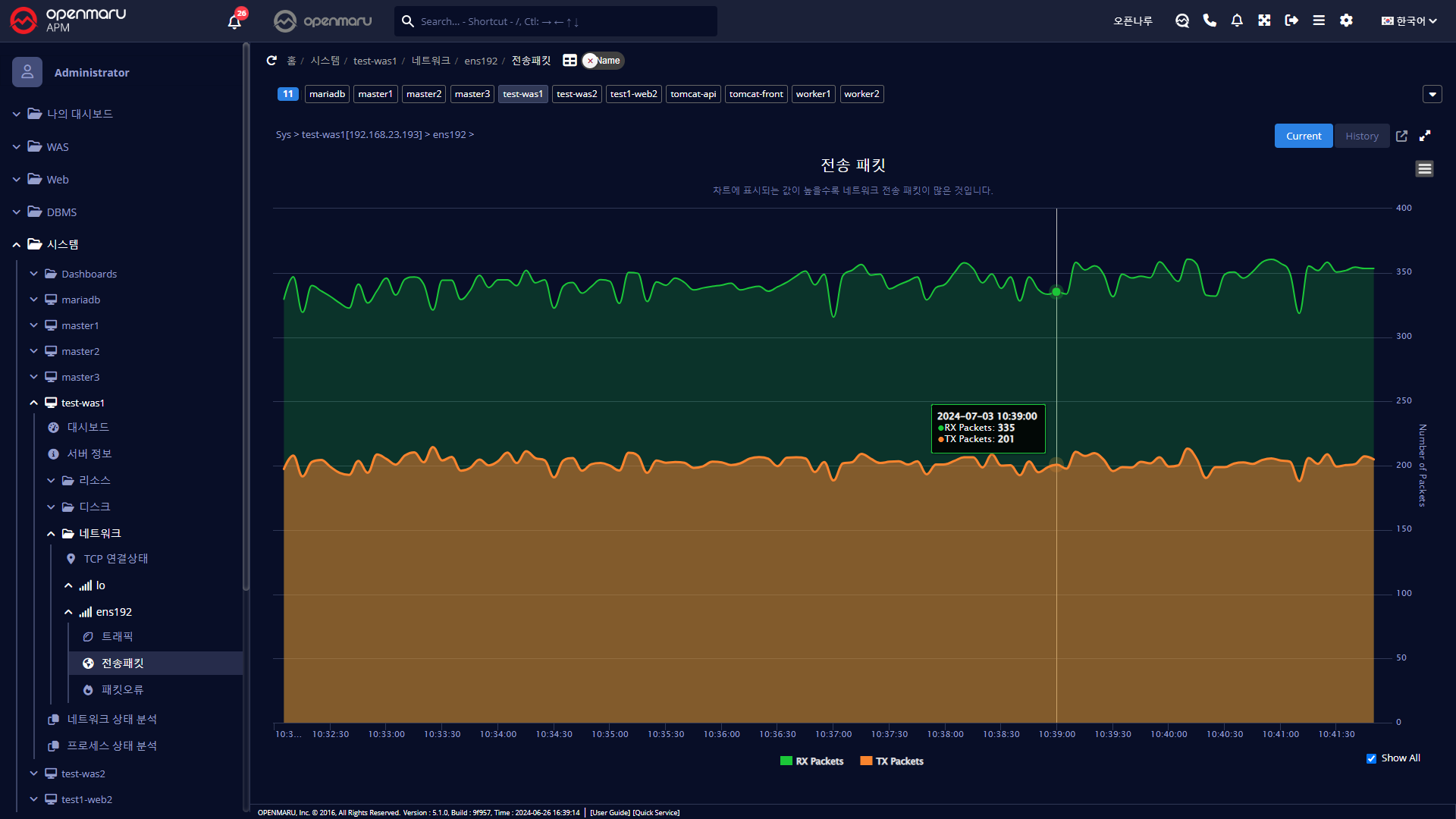 시스템의 네트워크 인터페이스 카드 별로 데이터 초당 Send/Receive 패킷 수를 그래프로 표시한다.
