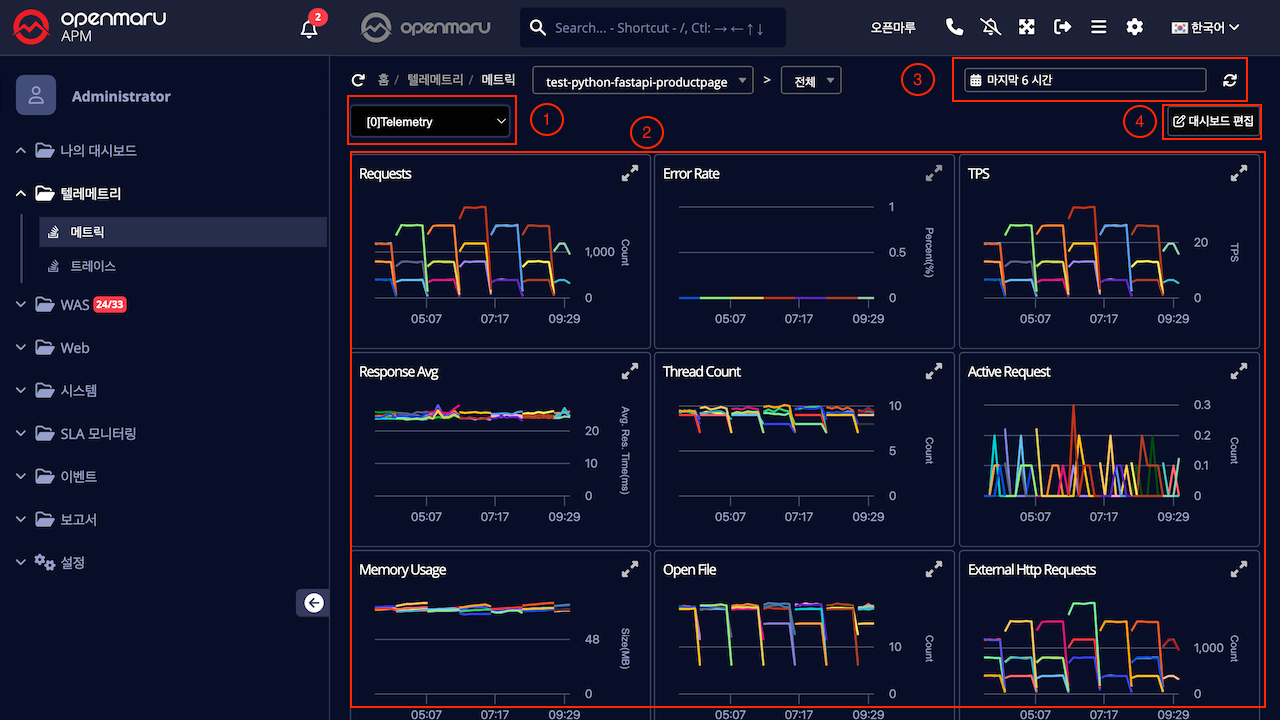Openmaru 에서 기본적으로 제공하는 Telemetry 대시보드 나, 사용자정의 대시보드를 선택하여 모니터링 할 수 있습니다.
