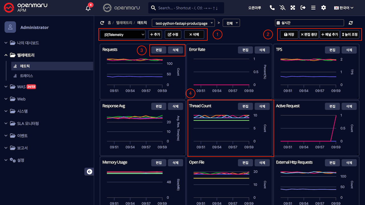 Telemetry 메트릭 대시보드는 Java, Node.js, Python, Golang 애플리케이션의 메트릭 데이터를 모니터링할 수 있는 통합 모니터링 대시보드입니다. 기본적으로 14개의 패널이 제공되며, 실시간 및 조회범위를 조정하여 수집 데이터를 확인할 수 있으며, 필요에 따라 대시보드와 패널을 추가,수정,삭제 할 수 있습니다.