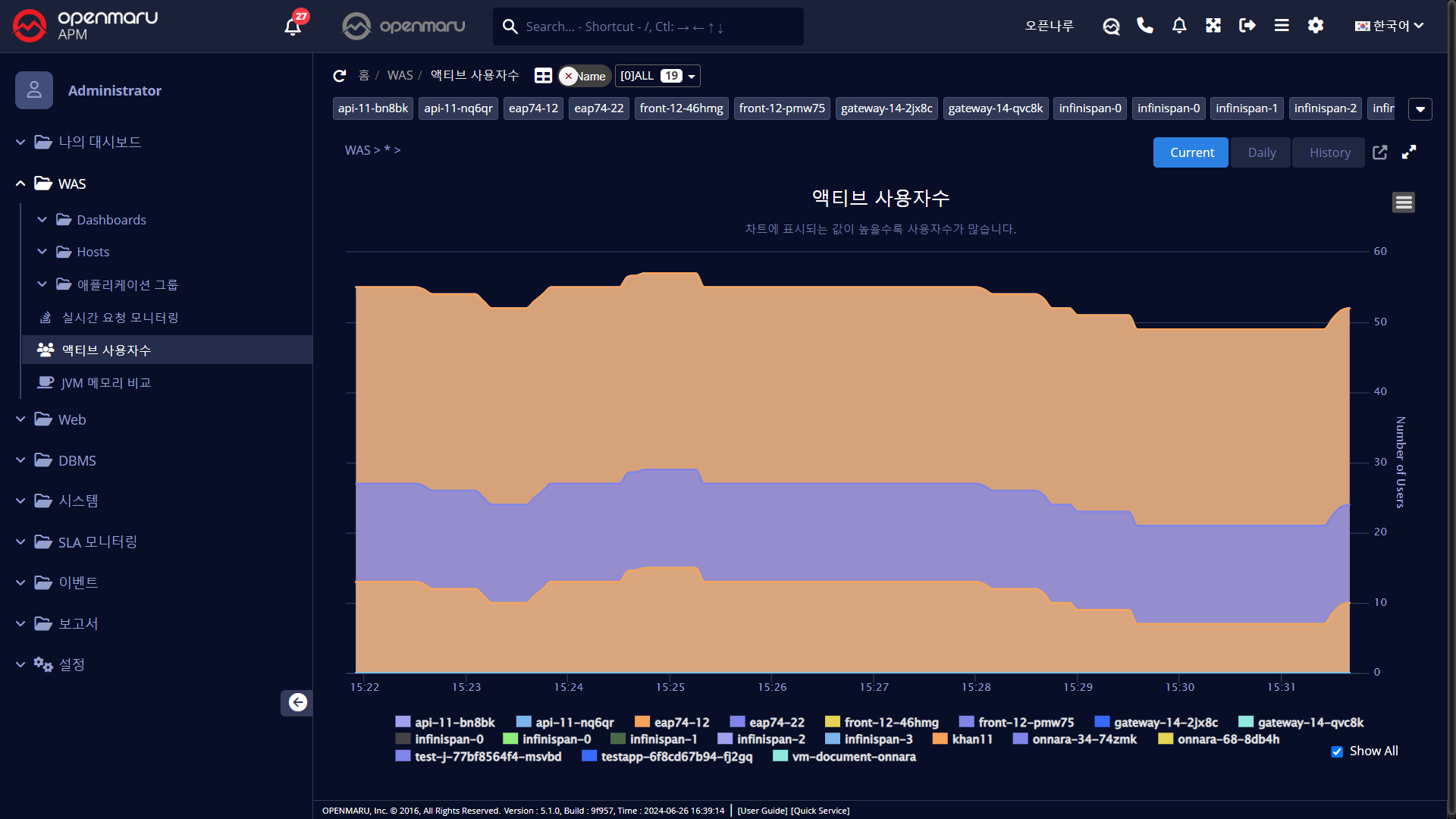 업무별로 구분하지 않고, 모니터링 대상 모든 WAS의 액티브 사용자수(5분동안 Request가 있었던 유일한 사용자 수)를 합산하여 그래프로 출력한다.