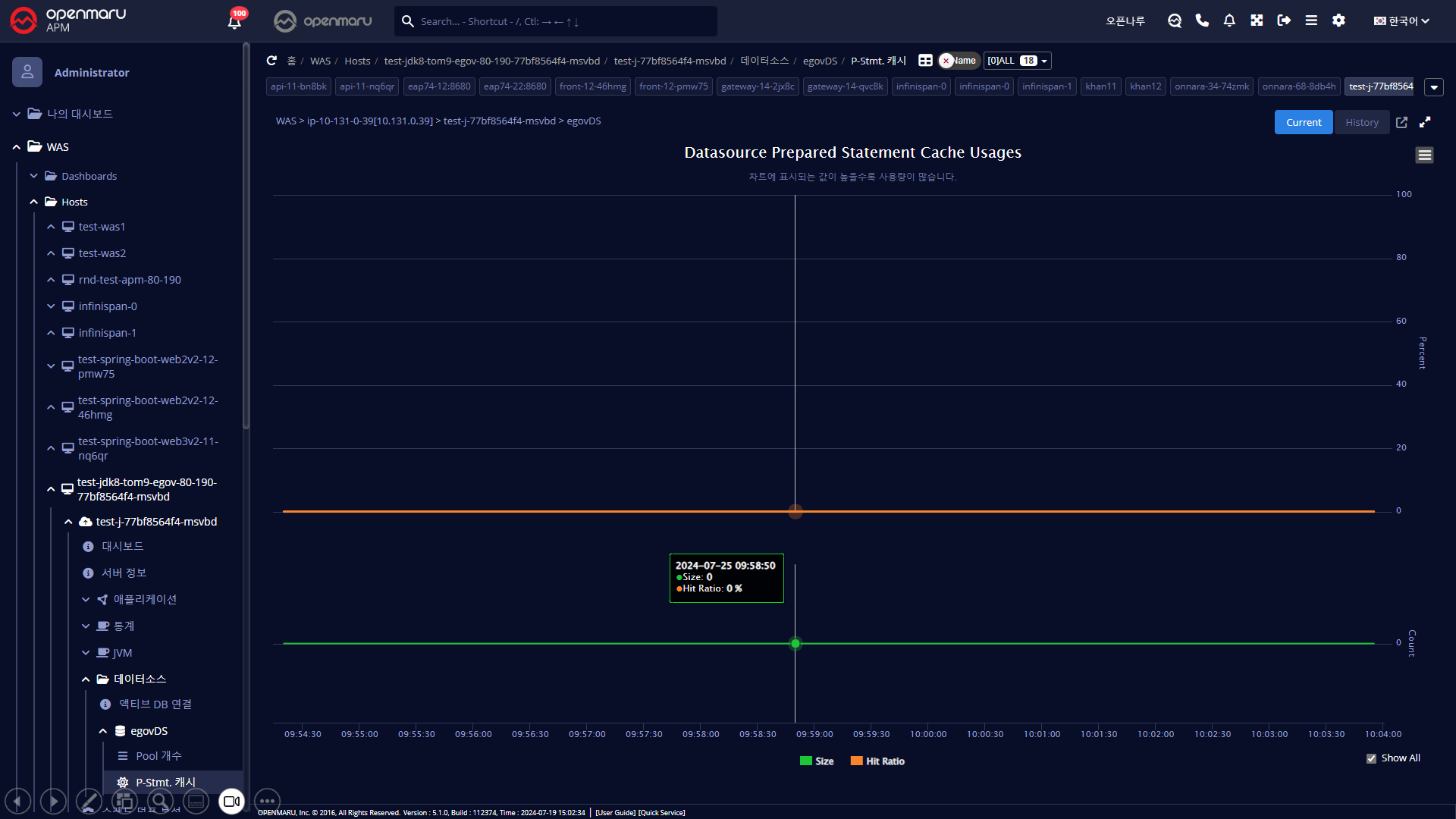 WAS 인스턴스의 Database 연결 풀에서 사용중인 Prepared Statement의 캐시의 크기와 활용율(Hit Ratio)를 그래프로 표시한다. Apache Tomcat, JBoss EAP 5등의 WAS의 경우 Prepared Statement Cache 정보를 제공하지 않아 표시되지 않는다.