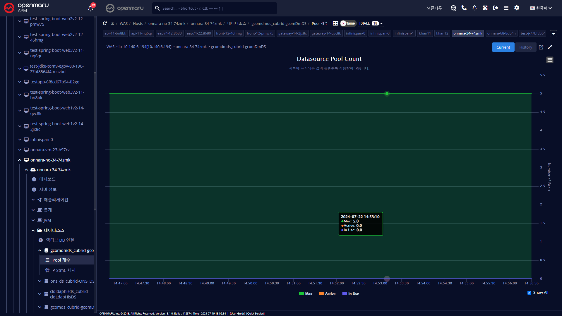 WAS에서 설정한 데이터소스 연결 풀의 개수를 그래프로 출력한다.