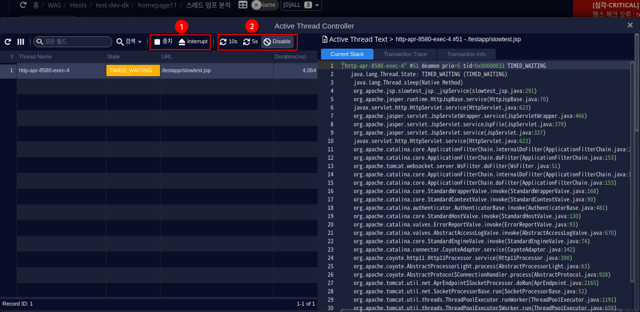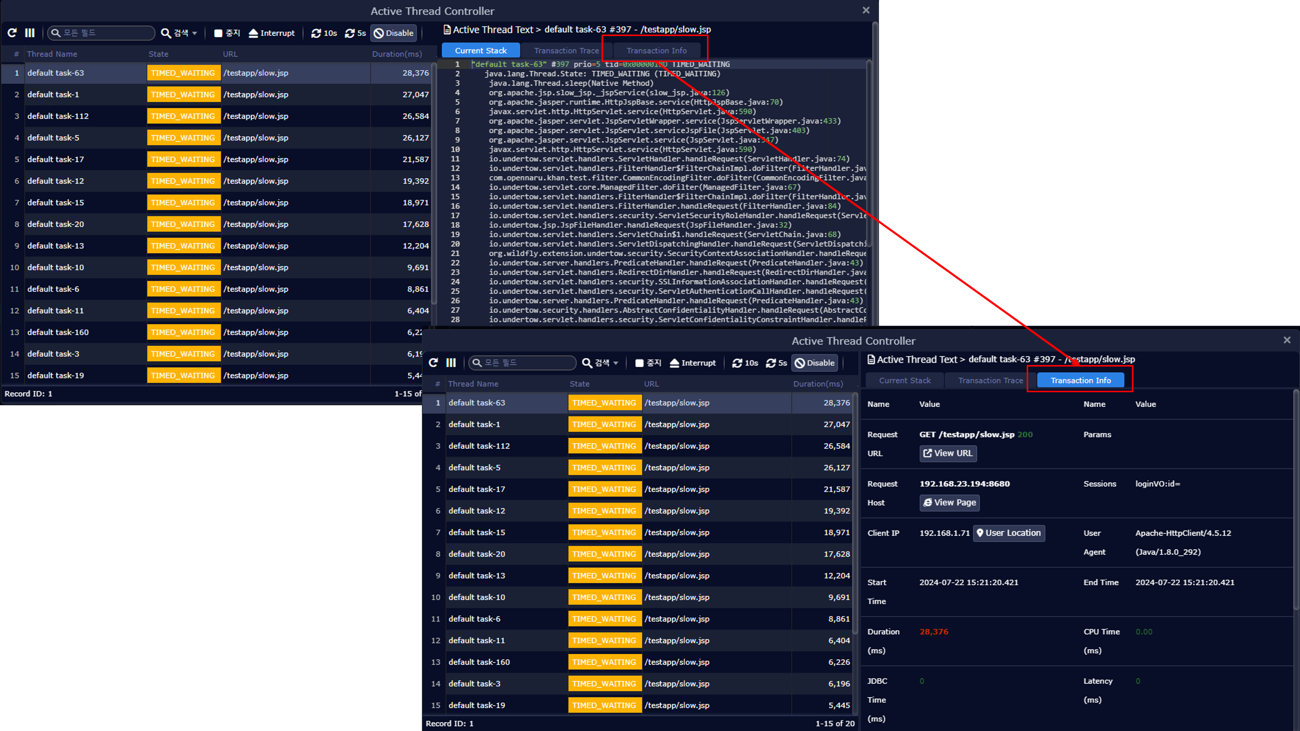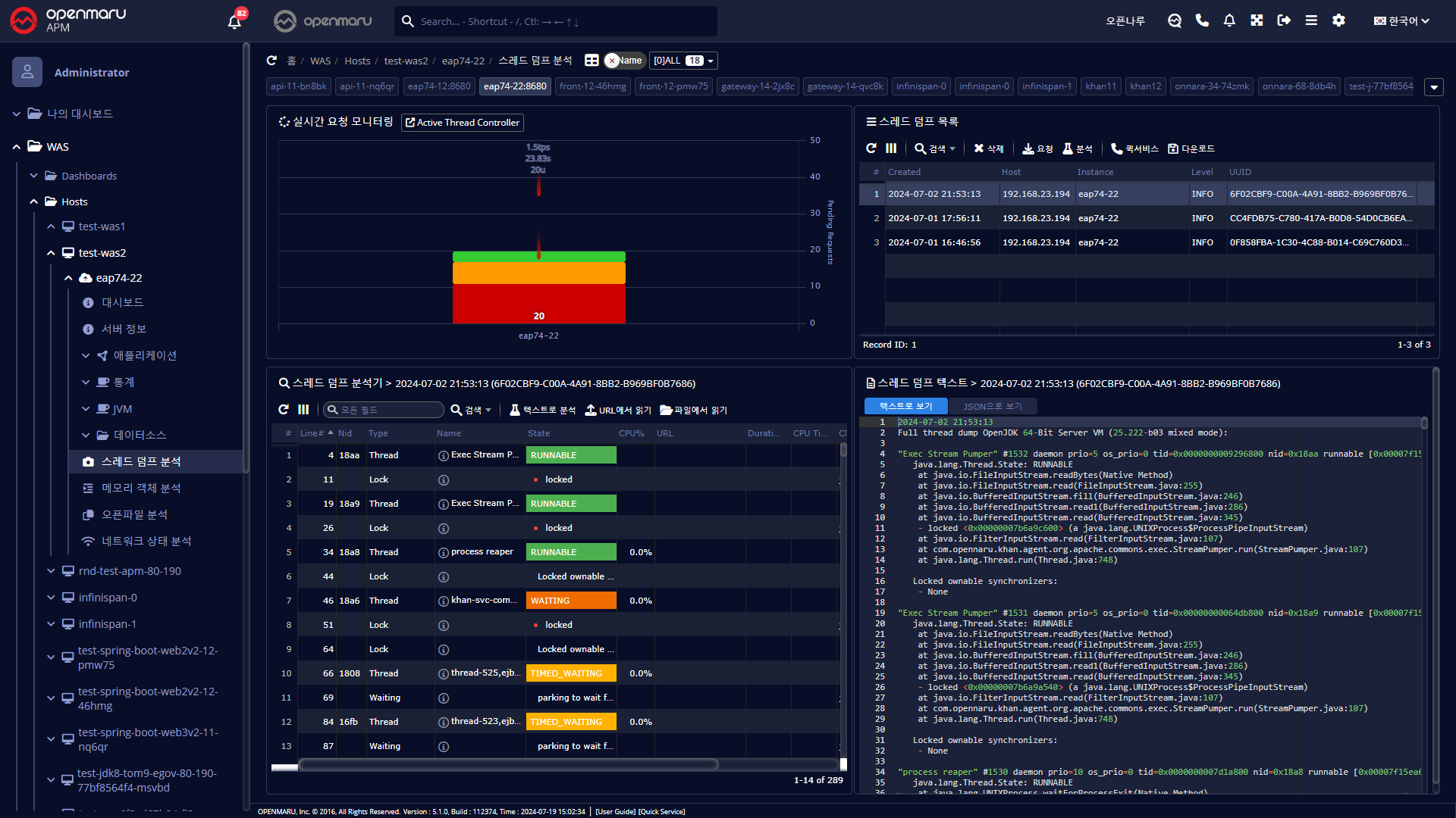 APM 사용자 가이드WAS 모니터링WAS 인스턴스별 스레드 덤프 분석이 페이지에서WAS 인스턴스별 스레드 덤프 분석 스레드 덤프 분석 WAS 인스턴스의 현재 실행중인 내용을 확인하려면 스레드 덤프를 이용하여 분석한다. 자세한 스레드 덤프의 분석 방법에 대해서는, 서버가 느려질 때 분석 방법을 참고하라. 액티브 스레드 컨트롤
