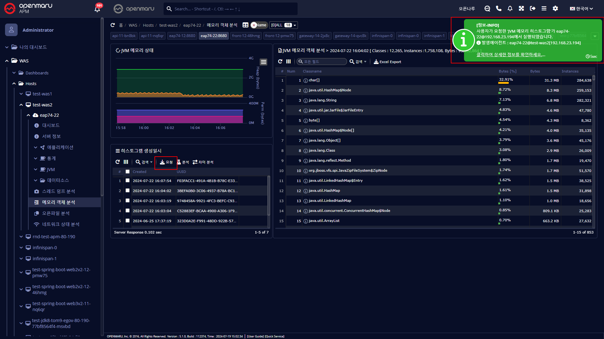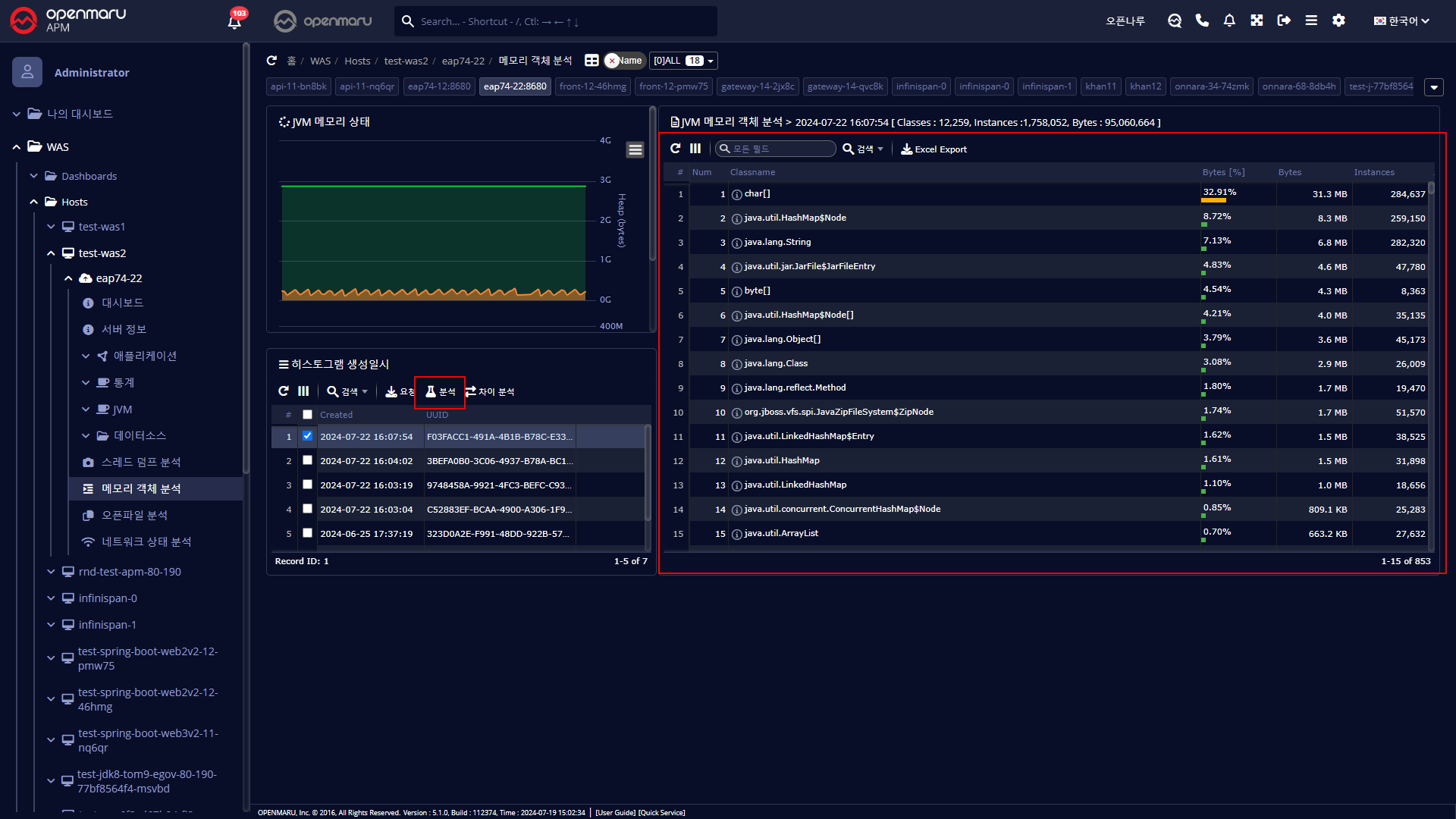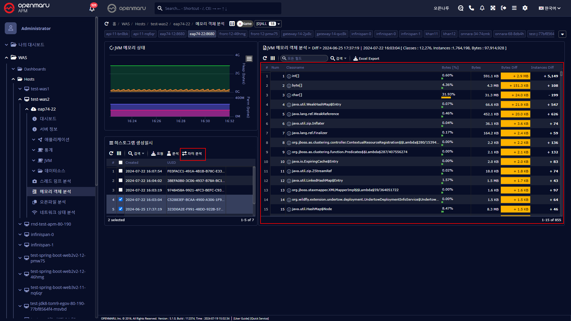 APM 사용자 가이드WAS 모니터링WAS 인스턴스별 메모리 객체 분석이 페이지에서WAS 인스턴스별 메모리 객체 분석 메모리 객체 분석 해당 WAS 인스턴스가 사용하고 있는 객체를 분석할 수 있다. 요청 버튼을 클릭하여 히스토그램을 생성한다. 히스트그램을 선택하고 분석 버튼을 눌러 결과를 볼 수 있다. 차이 분석하고자하는 히스토그램을 선택한다. '차이 분석' 버튼을 통하여 전/후 객체 변화를 파악 할 수도 있다.