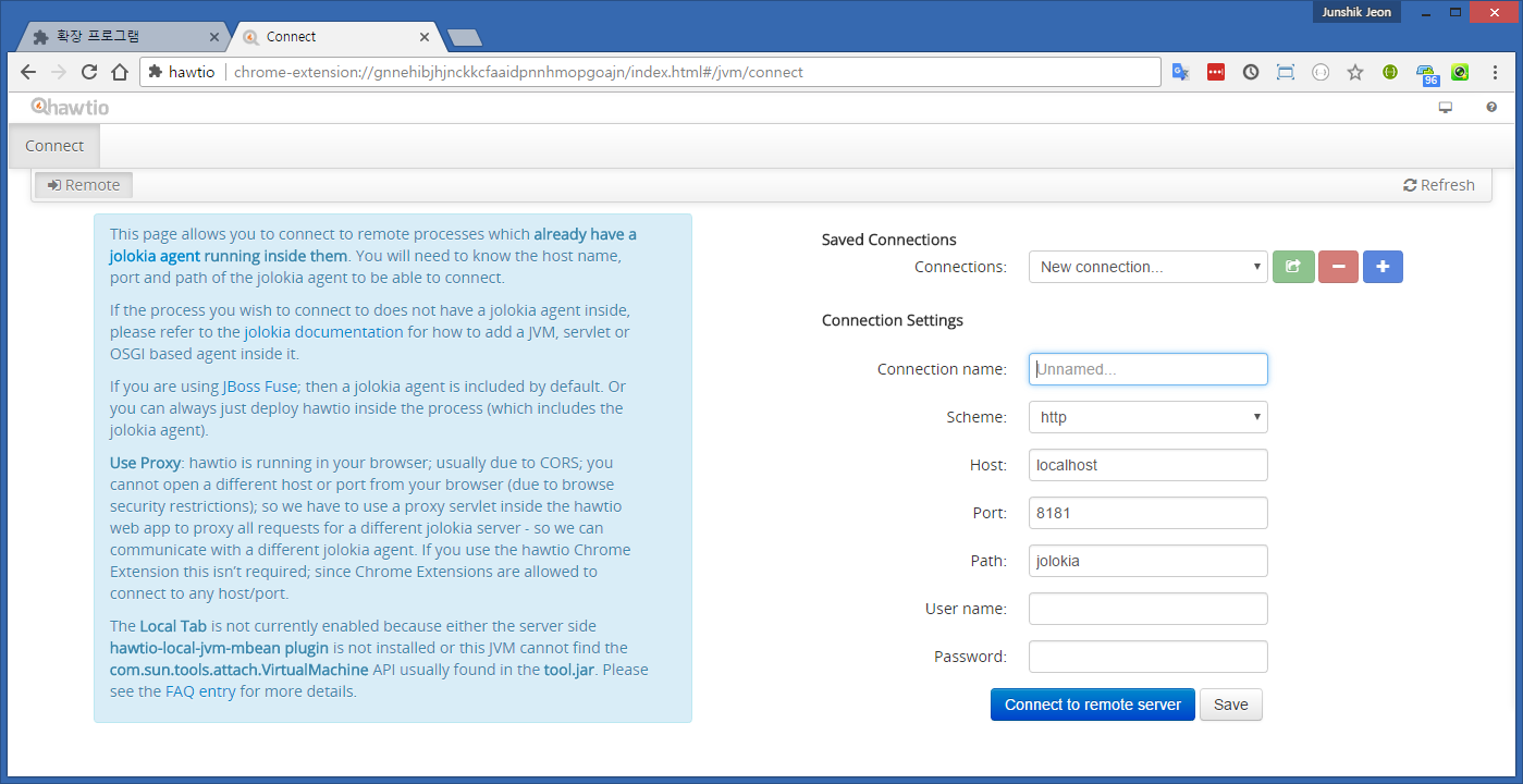 JBoss 서버의 IP 주소와 HTTP 접속 포트, JBoss Admin Console로 접속하기 위한 ID, 패스워드를 입력한 후 ‘Connect to remote server’를 클릭한다.