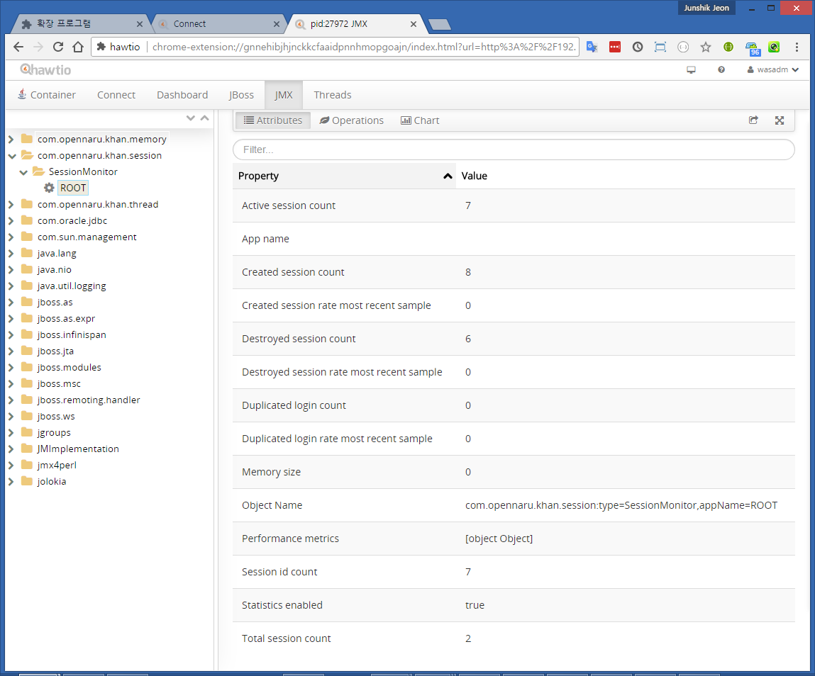 com.opennaru.khan.session 🡪 Context 이름(ROOT)를 클릭하면 세션 정보를 확인할 수 있다.