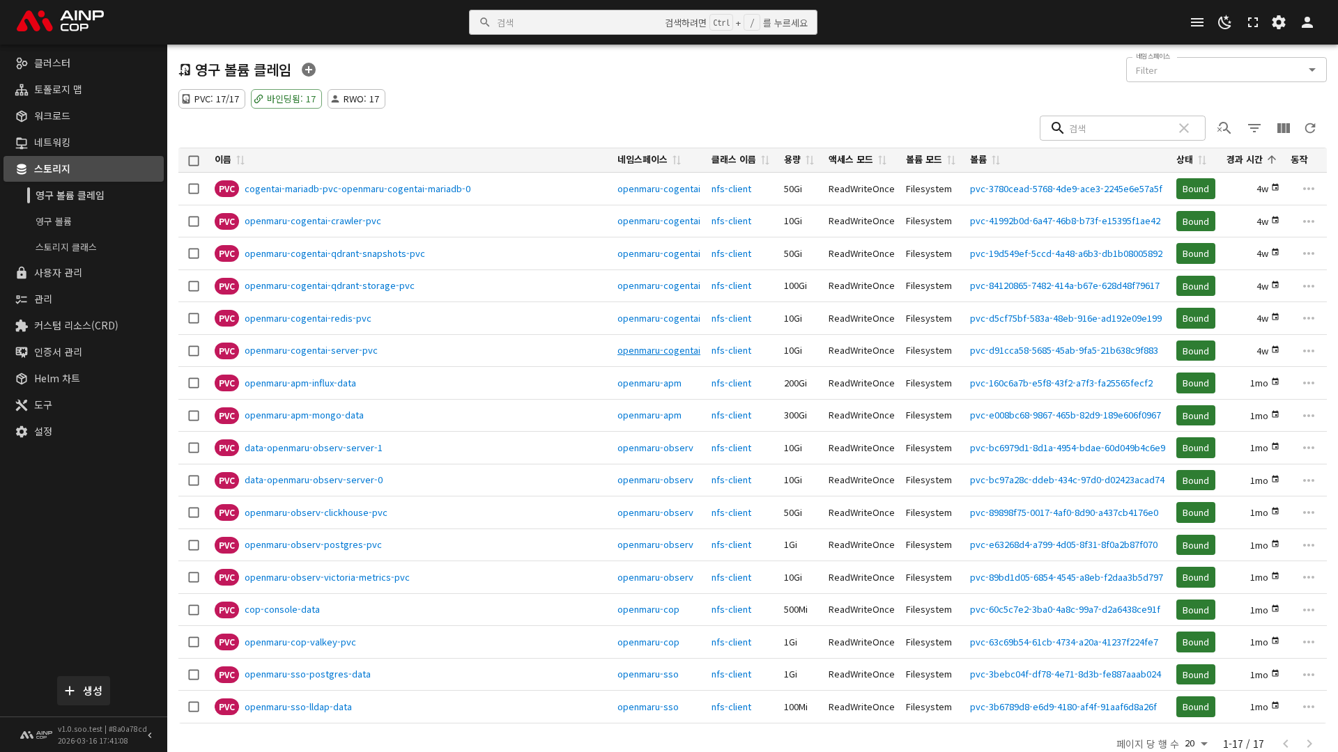 사이드바에서 스토리지 > 영구 볼륨 클레임을 선택하면 현재 네임스페이스의 PVC 목록이 표시됩니다. 목록에서는 다음 정보를 확인할 수 있습니다.