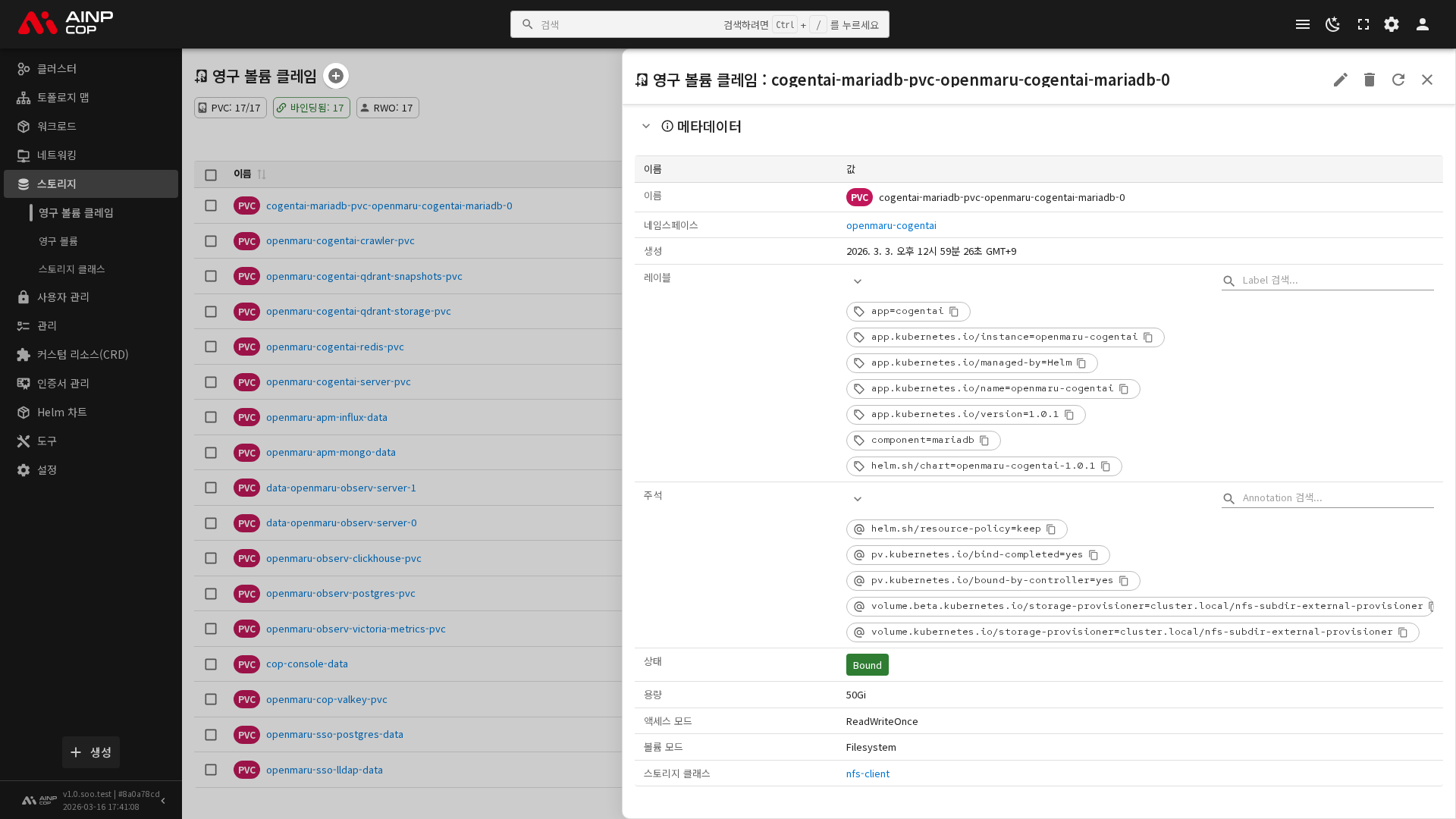 - 바인딩 정보: 연결된 PV 이름 (클릭하면 PV 상세로 이동)