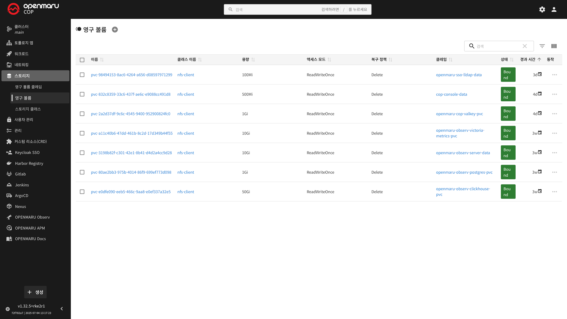1. 영구 볼륨(PV) 목록 화면 구성