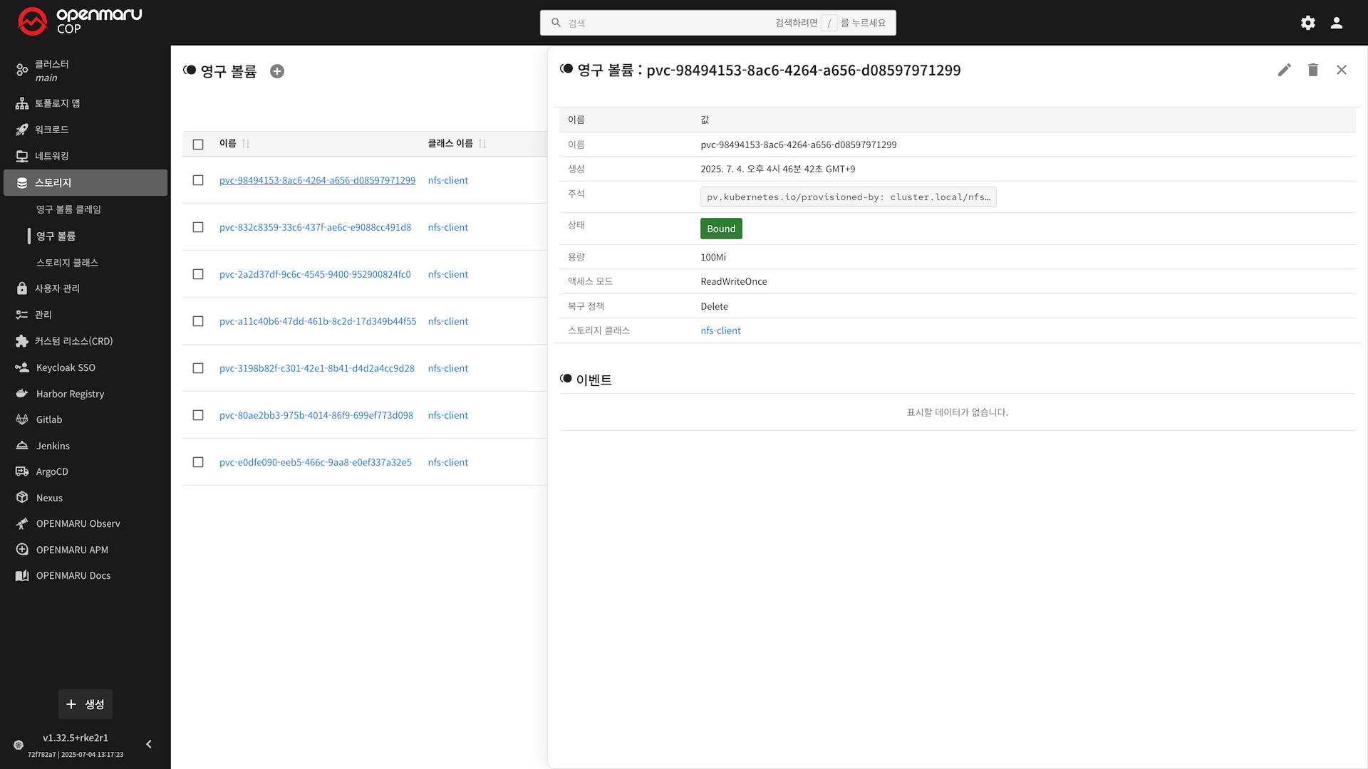 1. 영구 볼륨(PV) 목록 화면 구성