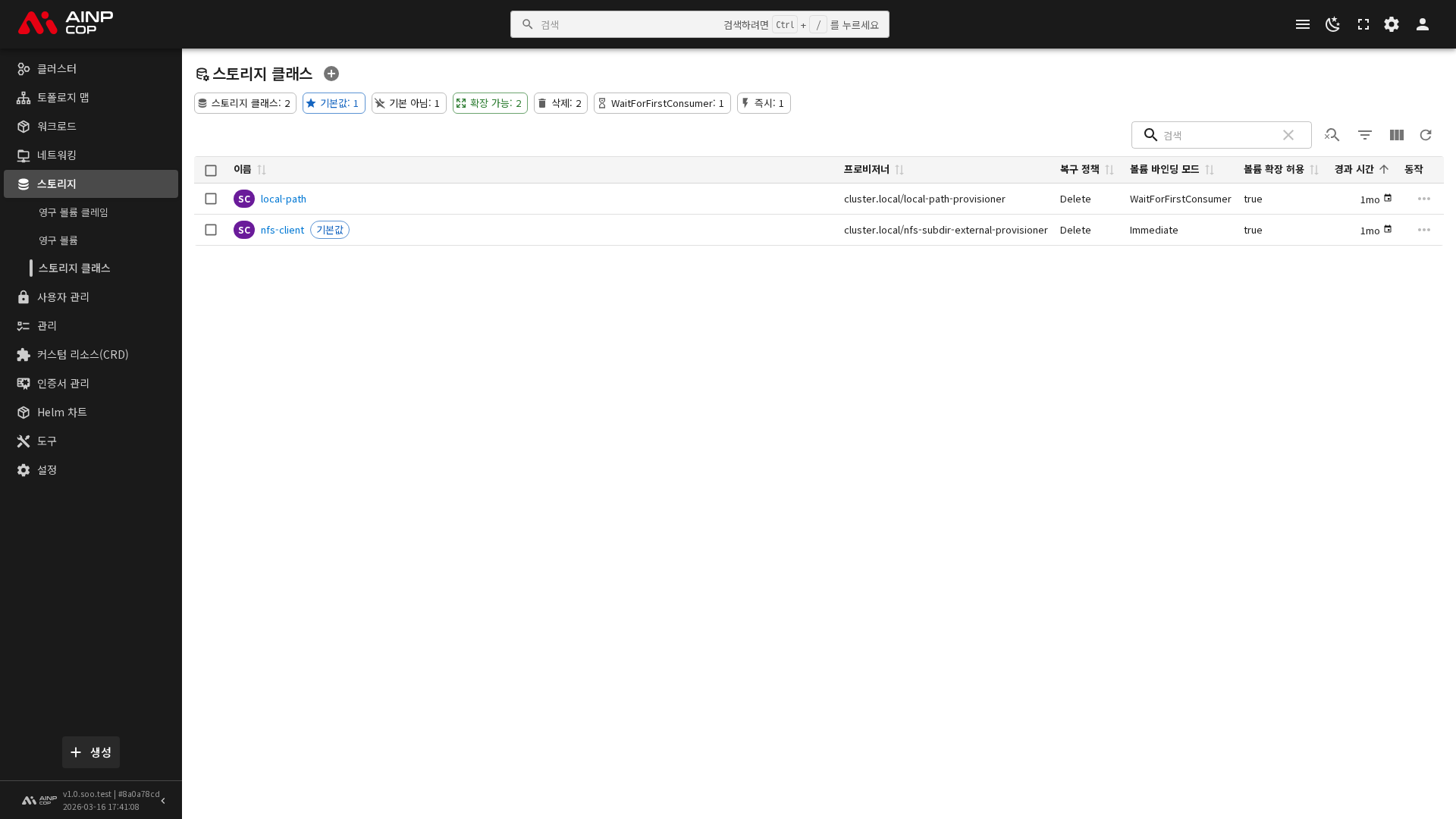 목록에서는 각 스토리지 클래스의 이름, 프로비저너, 회수 정책, 볼륨 바인딩 모드, 기본 여부를 확인할 수 있습니다. 기본 스토리지 클래스는 PVC에서 스토리지 클래스를 명시하지 않을 때 자동으로 적용됩니다.