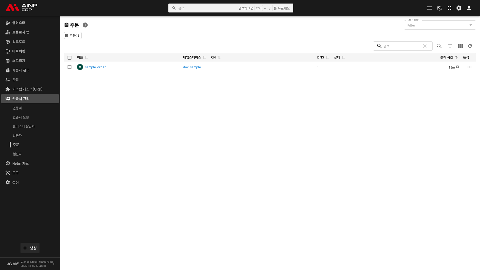 사이드바에서 인증서 관리 > Order를 선택하면 현재 클러스터에 존재하는 Order 목록이 표시됩니다. 목록에서는 다음 정보를 확인할 수 있습니다.