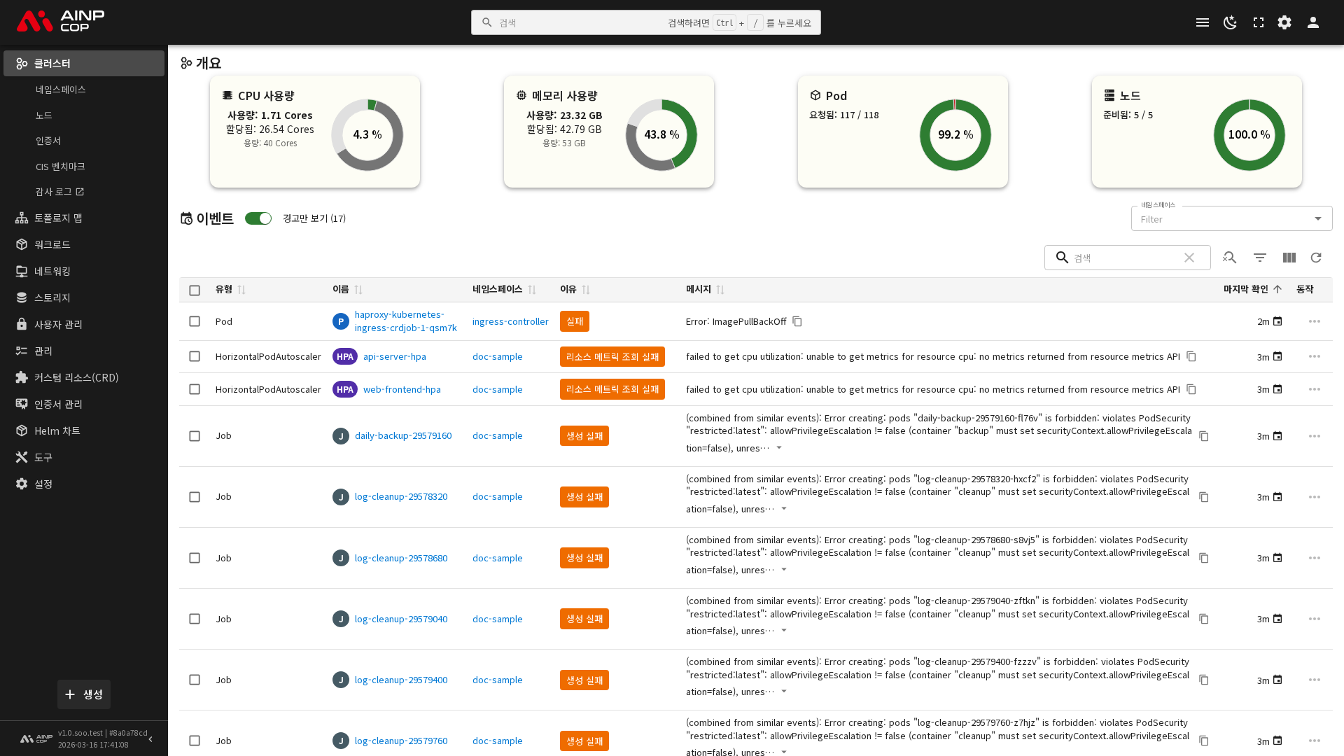 - 리소스 현황 카드: 주요 리소스별 개수와 상태를 카드 형태로 표시합니다.