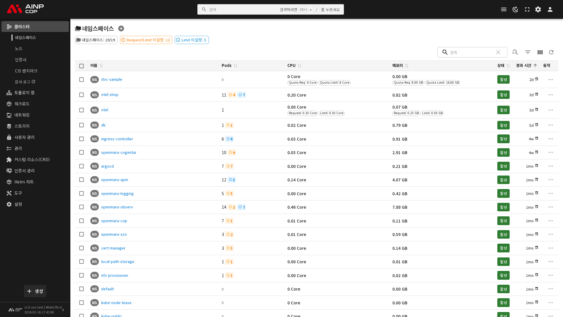 사이드바에서 클러스터 > 네임스페이스를 선택하면 클러스터 내 모든 네임스페이스 목록이 표시됩니다.
