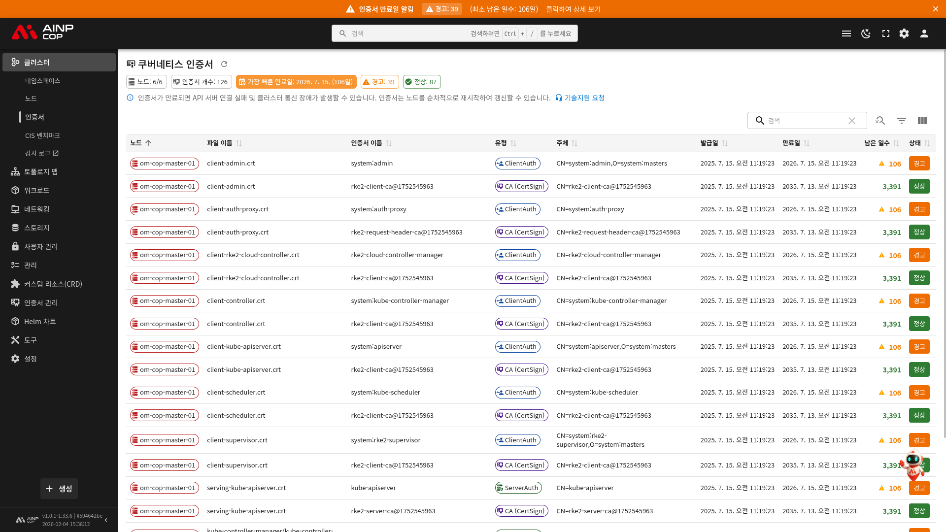 인증서 만료는 클러스터 통신 장애를 유발할 수 있 으므로 정기적으로 상태를 확인하시기 바랍니다.