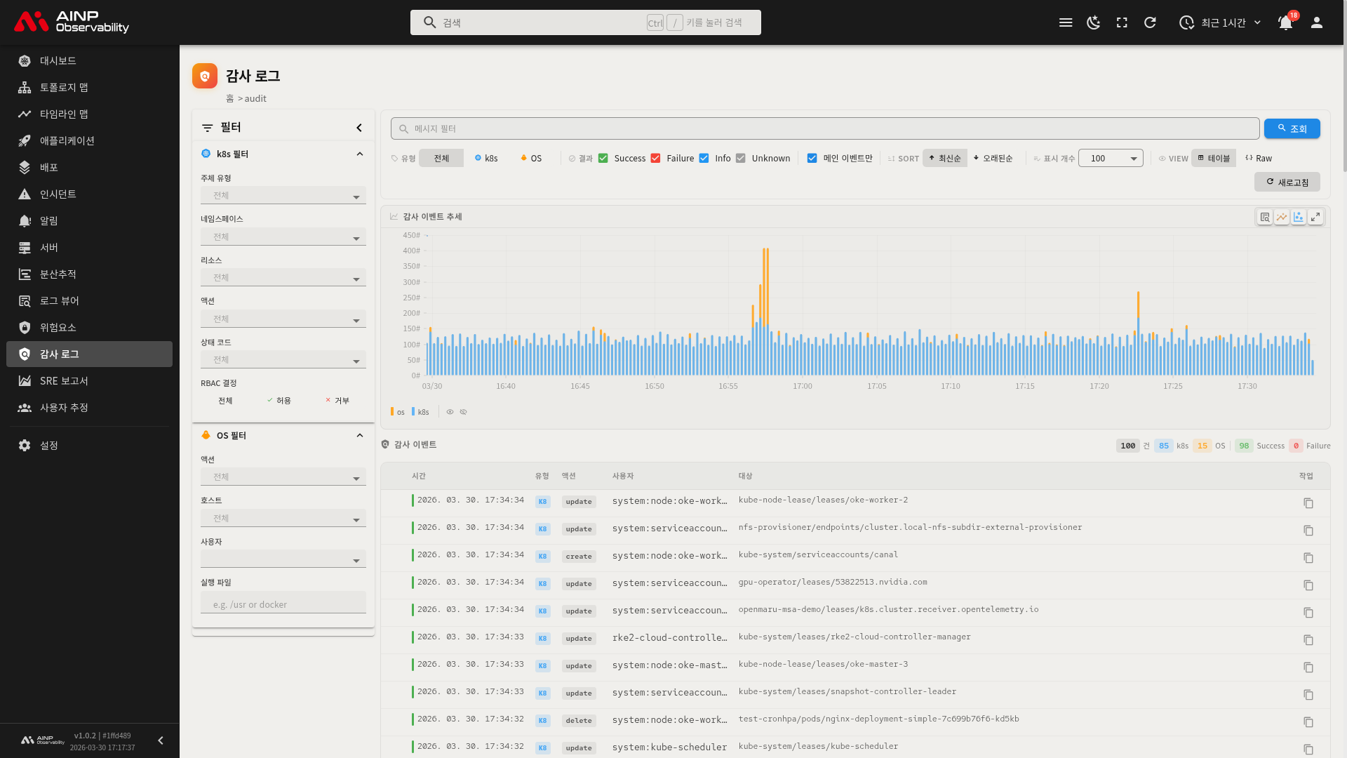 참고: 감사 로그 기능은 Observability 시스템이 연동되어 있는 환경에서 사용할 수 있습니다.
