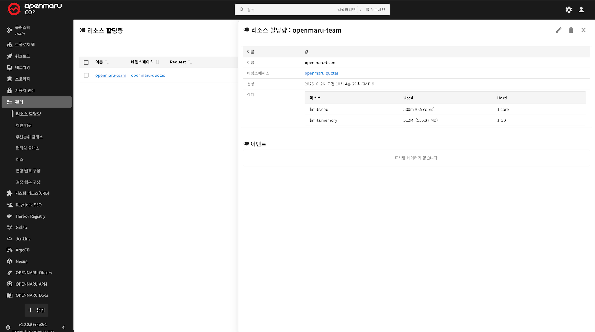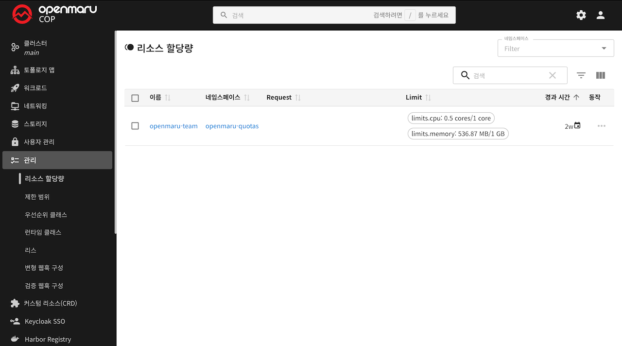 openmaru-team) - 네임스페이스: 리소스 할당량이 적용되는 네임스페이스입니다.