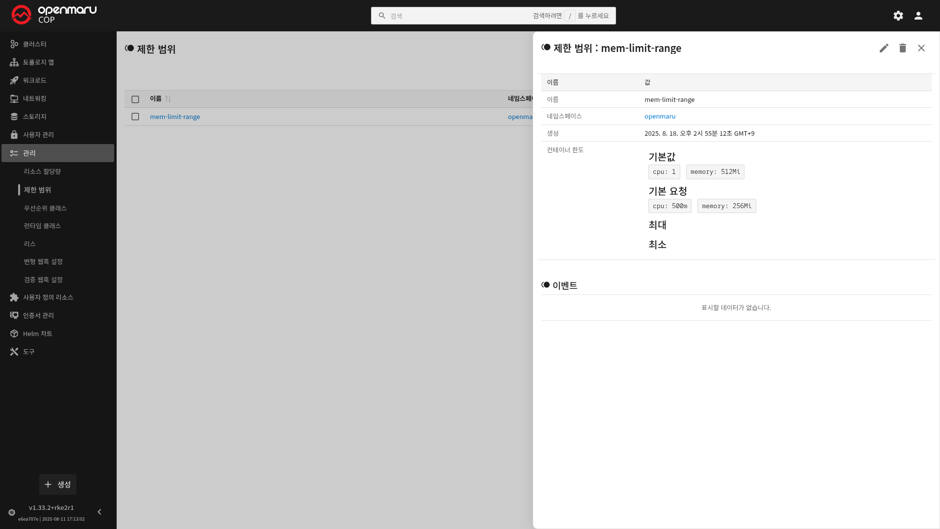 COP 콘솔의 제한 범위 화면에서는 네임스페이스 단위로 파드(Pod) 및 컨테이너의 자원 요청/제한을 사전 정의할 수 있는 LimitRange 리소스를 관리합니다.