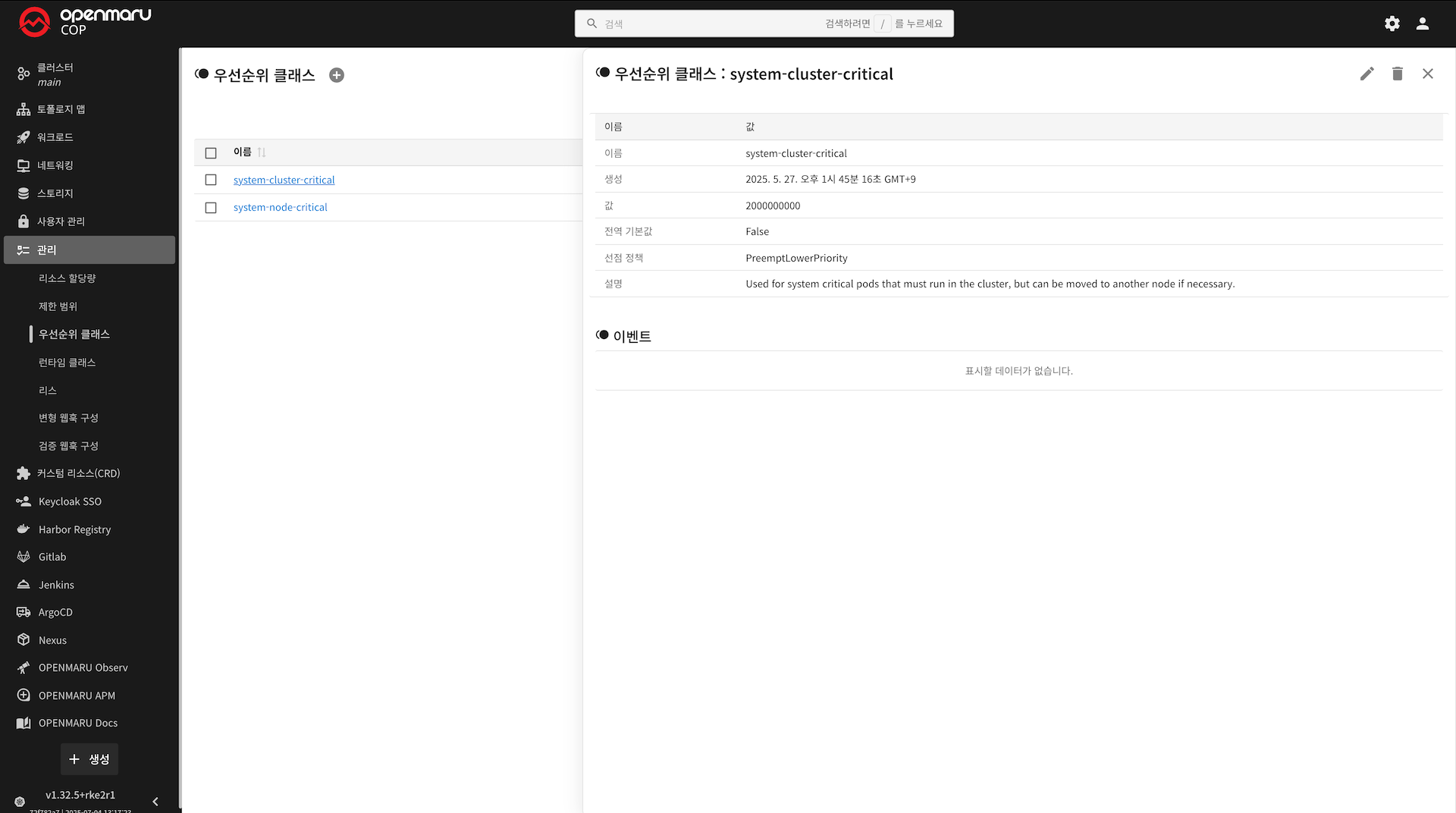 COP 콘솔에서는 커스텀 리소스(CRD) 인스턴스의 상세 정보를 GUI를 통해 확인할 수 있습니다. 아래는 system-cluster-critical PriorityClass 리소스 인스턴스의 상세 화면 예시입니다.