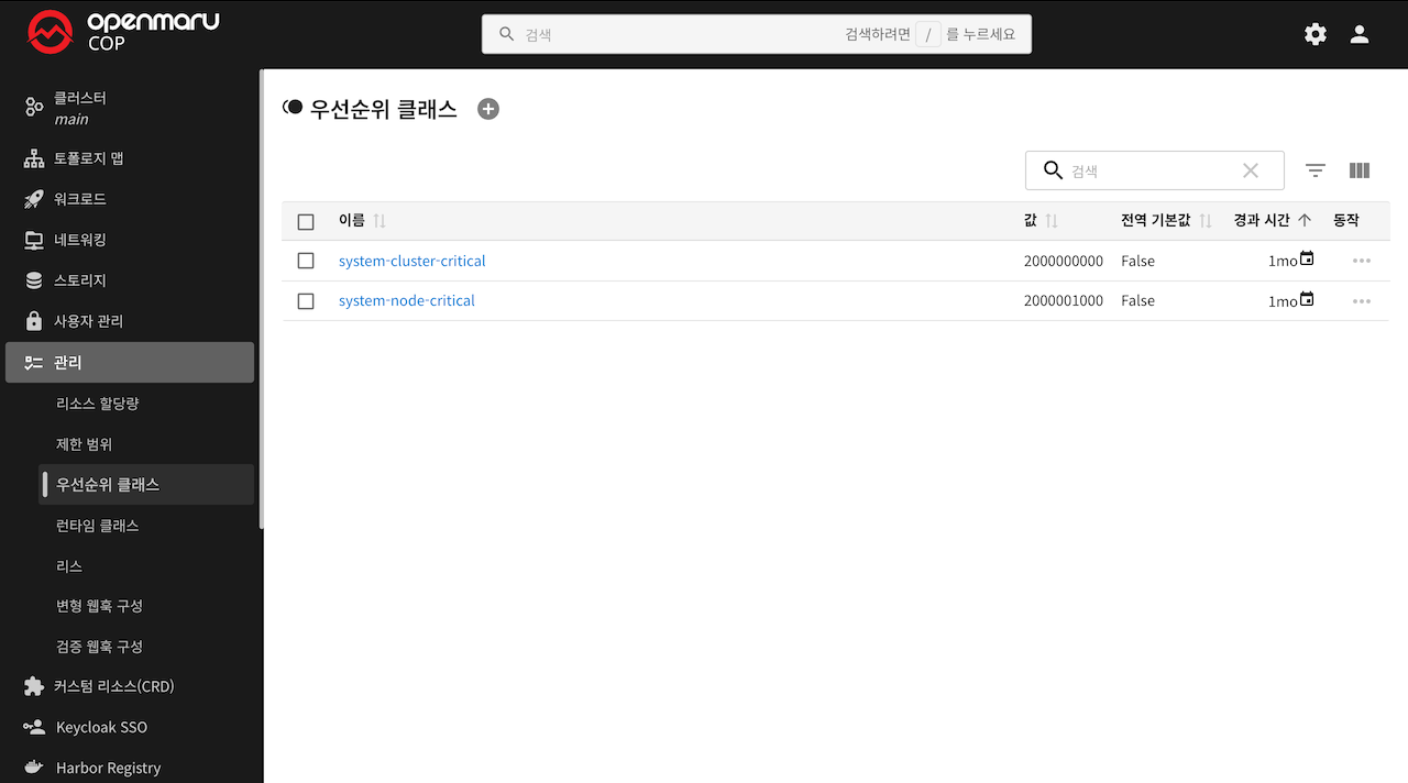 COP 콘솔의 우선순위 클래스 메뉴에서는 파드(Pod)의 중요도에 따라 스케줄링 및 축출(eviction) 우선순위를 정의하는 PriorityClass 리소스를 관리할 수 있습니다.