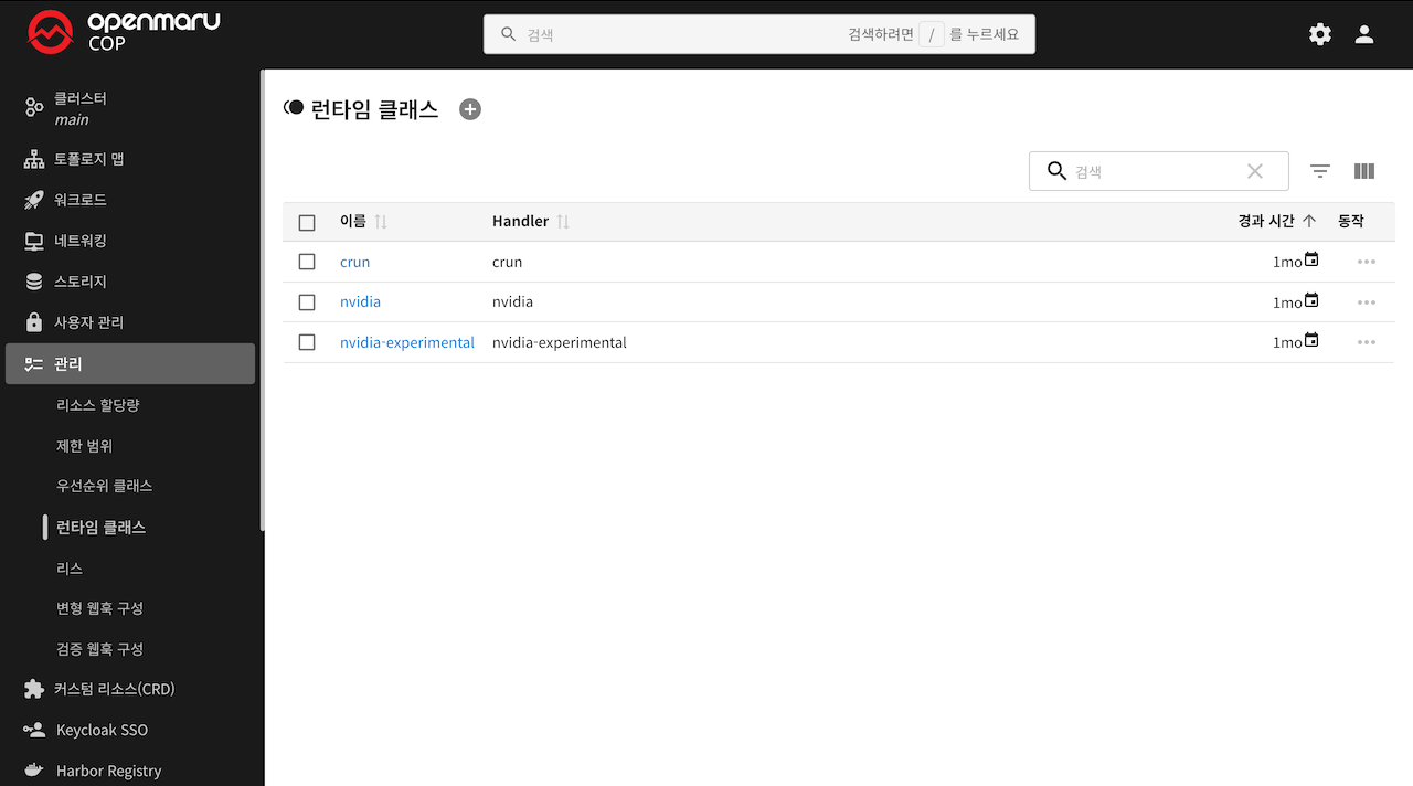COP 콘솔에서는 RuntimeClass를 쉽게 조회하고 관리할 수 있는 GUI를 제공합니다.