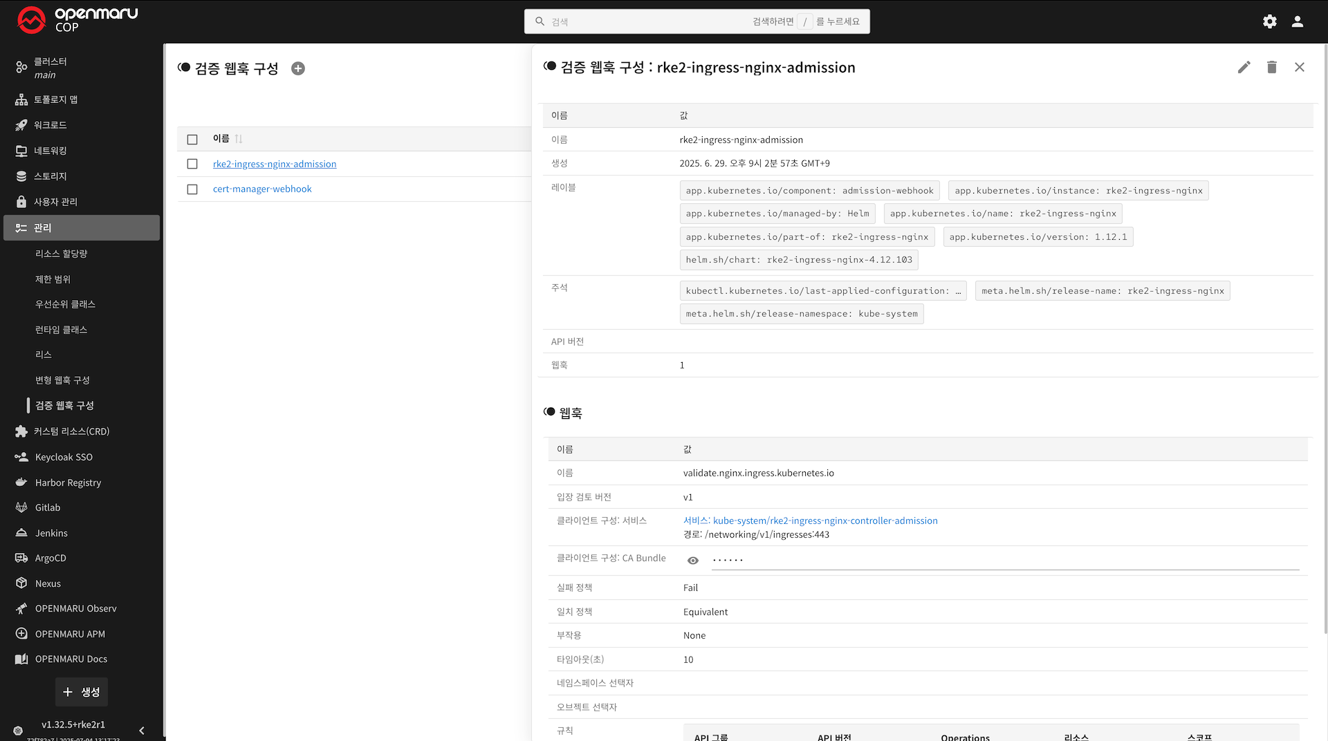 클러스터에 등록된 검증 웹훅 구성의 정보가 목록 형태로 표시됩니다. 각 항목은 다음과 같은 주요 정보를 포함합니다.