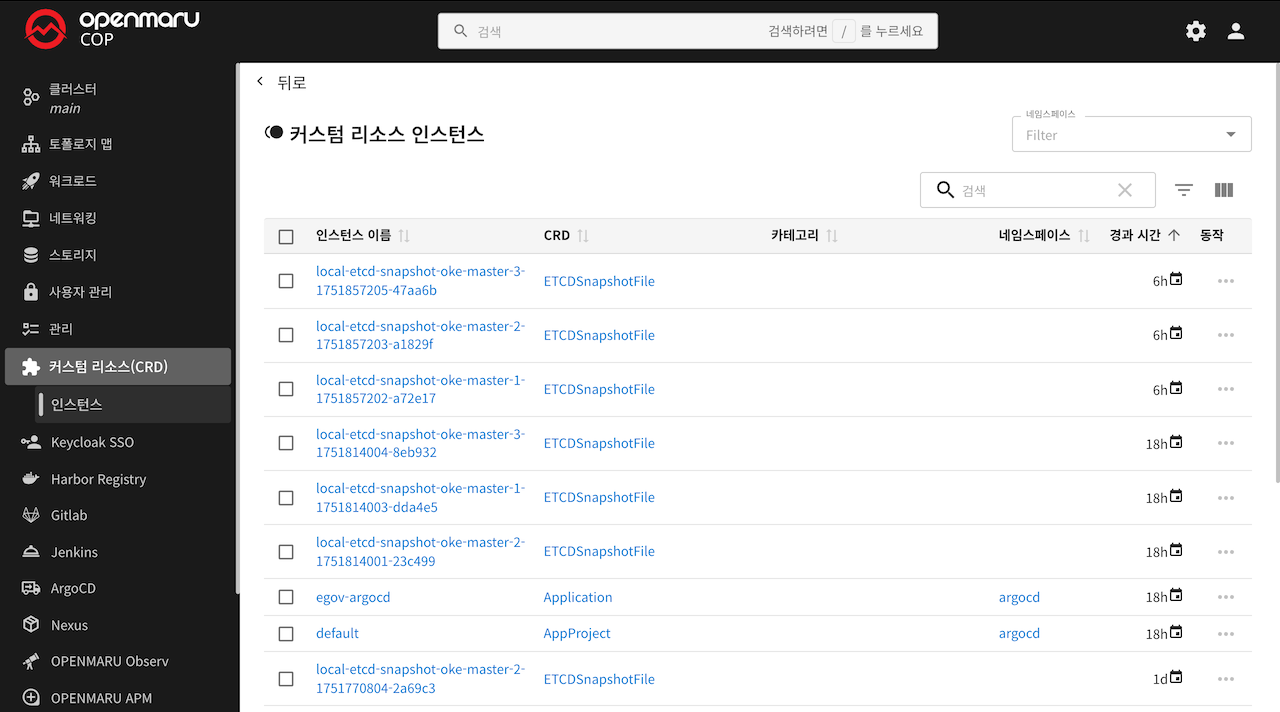 사용자는 CR 인스턴스를 조회, 편집, 삭제할 수 있으며, 필터링 및 정렬 기능을 통해 원하는 리소스를 빠르게 찾을 수 있습니다.