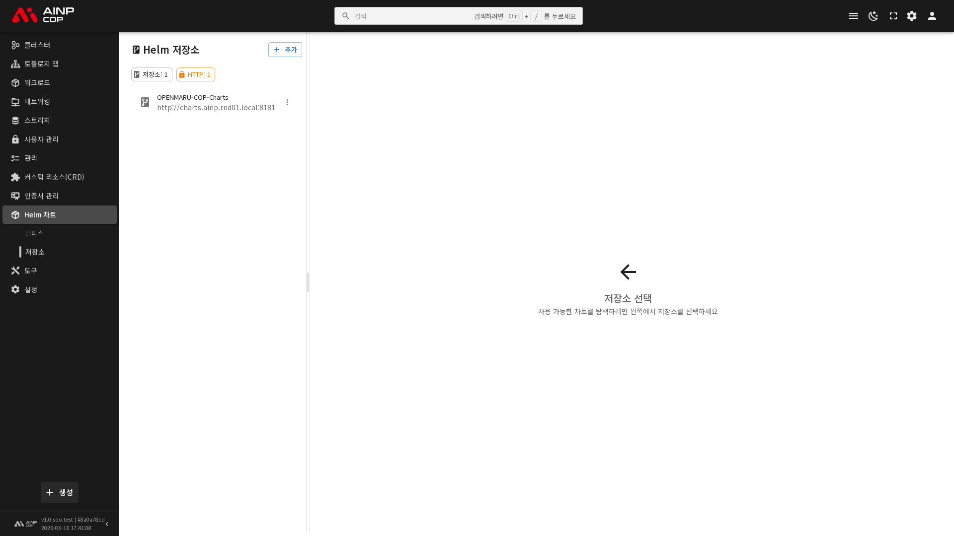 Helm 차트를 설치하려면 차트가 저장된 Repository(저장소)가 등록되어 있어야 합니다. COP Console에서는 저장소의 추가, 삭제 및 차트 목록 조회를 수행할 수 있습니다.