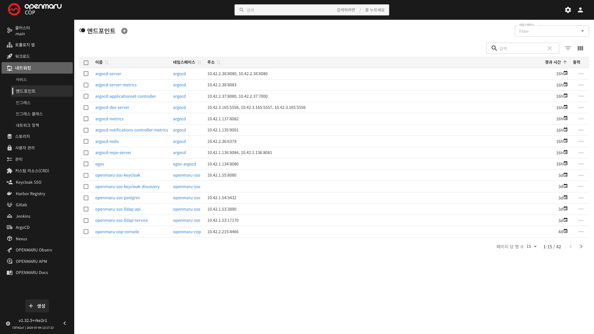 클러스터에 존재하는 엔드포인트들의 상세 정보가 목록 형태로 표시됩니다. 각 엔드포인트는 다음과 같은 주요 정보를 포함합니다.