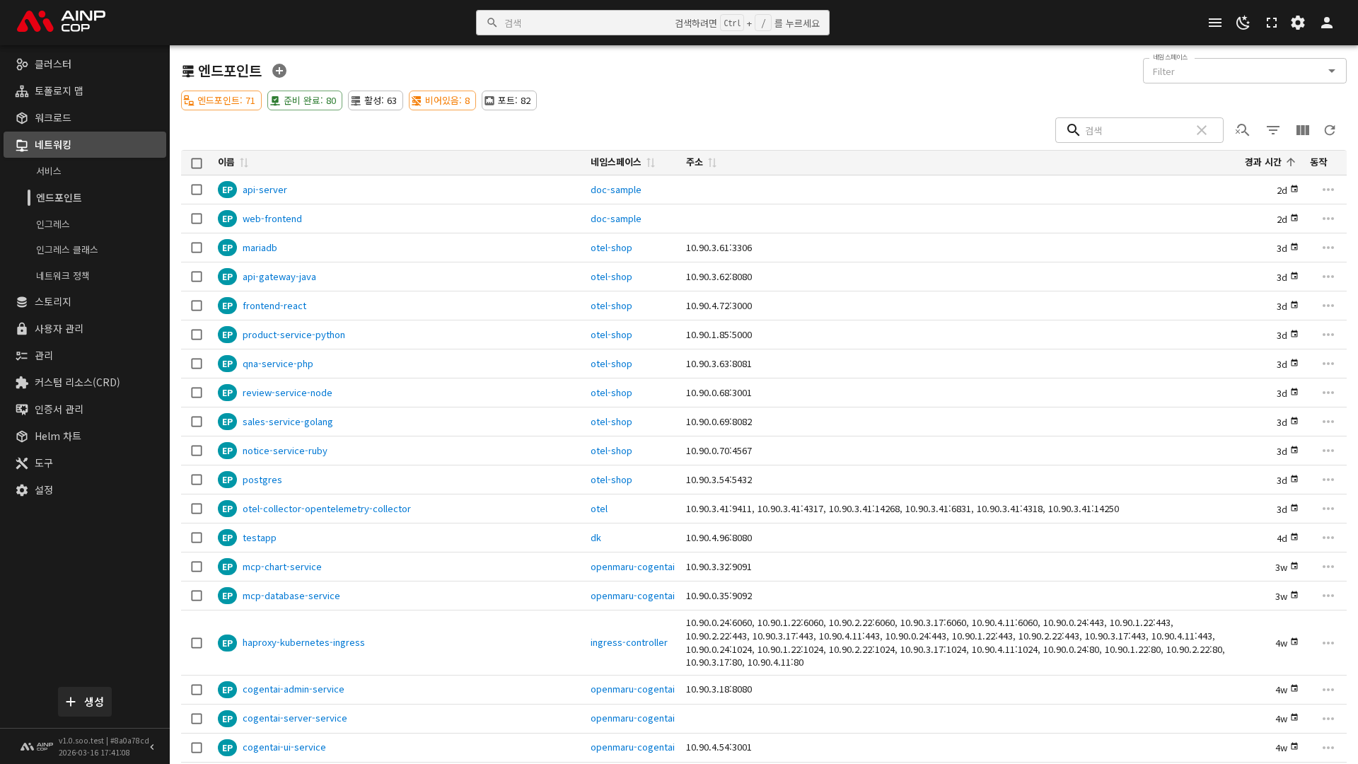 사이드바에서 네트워크 > 엔드포인트를 선택하면 현재 네임스페이스의 엔드포인트 목록이 표시됩니다. 각 엔드포인트에 대해 이름, 네임스페이스, 연결된 주소 수 등을 확인할 수 있습니다.