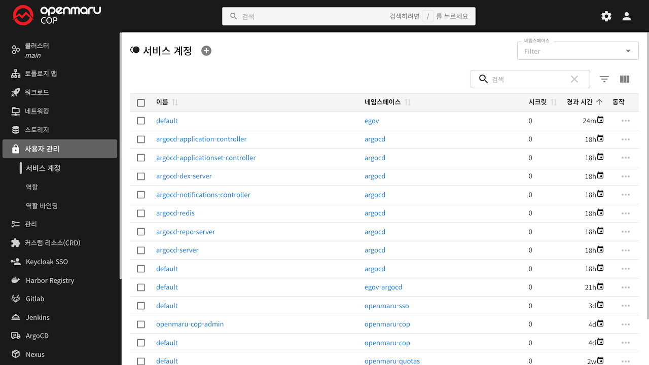 COP 콘솔은 클러스터 내의 서비스 계정을 효과적으로 관리할 수 있는 인터페이스를 제공합니다. 사용자는 서비스 계정을 생성, 조회, 수정 및 삭제할 수 있으며, 필터링 및 정렬 기능을 통해 원하는 정보를 쉽게 찾을 수 있습니다.