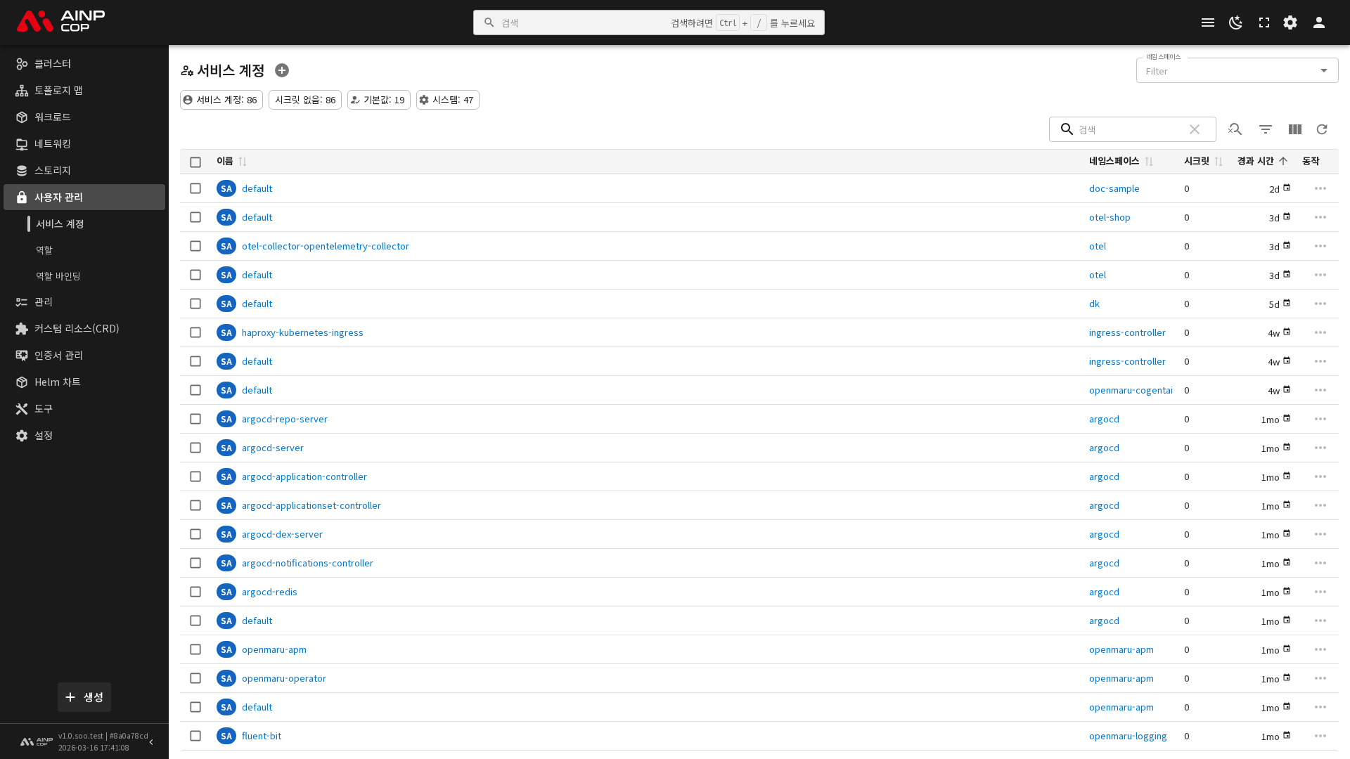 사이드바에서 보안 > 서비스 계정을 선택하면 현재 네임스페이스의 서비스 계정 목록이 표시됩니다. 각 네임스페이스에는 기본적으로 default 서비스 계정이 존재합니다.