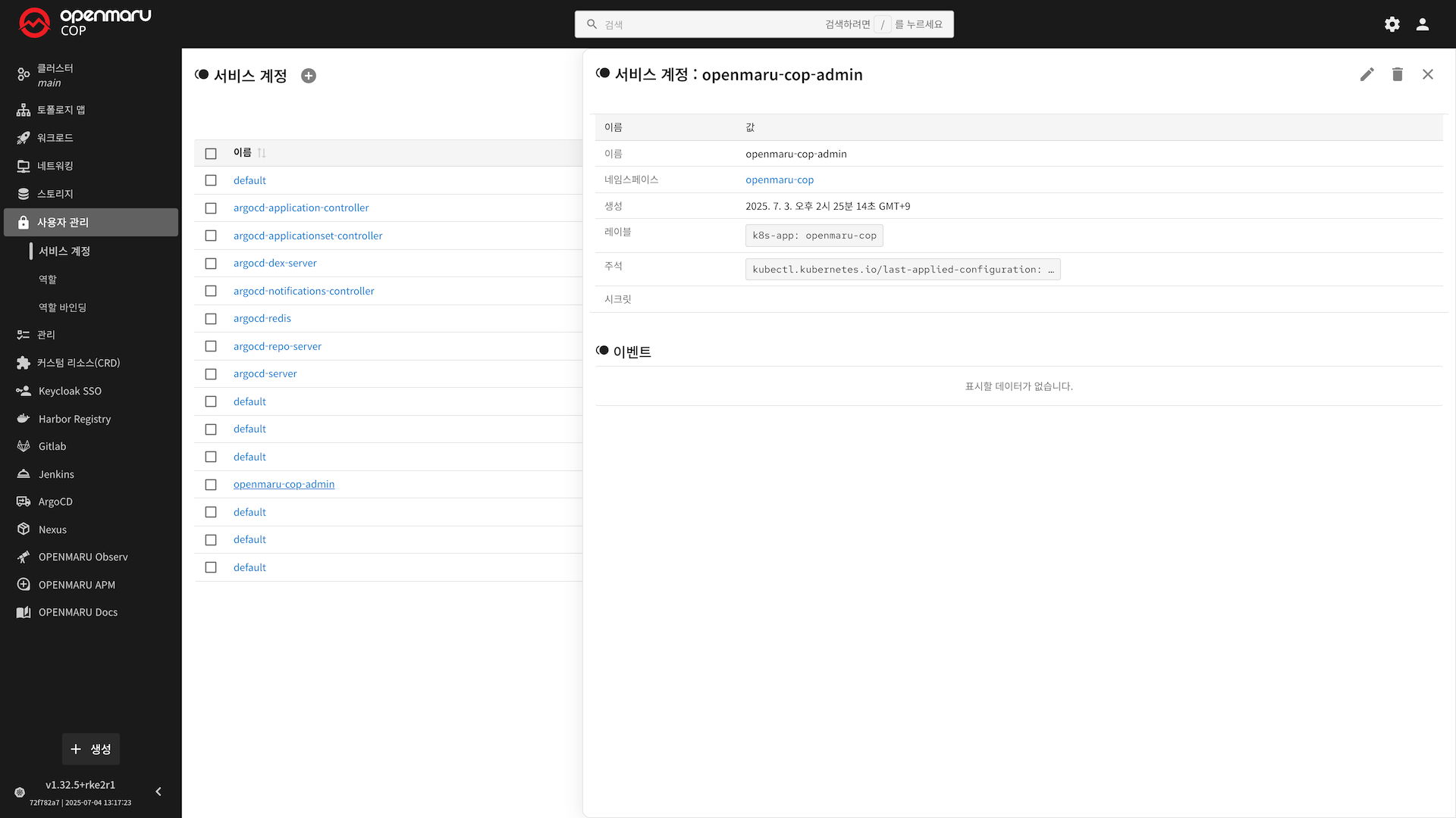 COP 콘솔은 클러스터 내의 서비스 계정을 효과적으로 관리할 수 있는 인터페이스를 제공합니다. 사용자는 서비스 계정을 생성, 조회, 수정 및 삭제할 수 있으며, 필터링 및 정렬 기능을 통해 원하는 정보를 쉽게 찾을 수 있습니다.