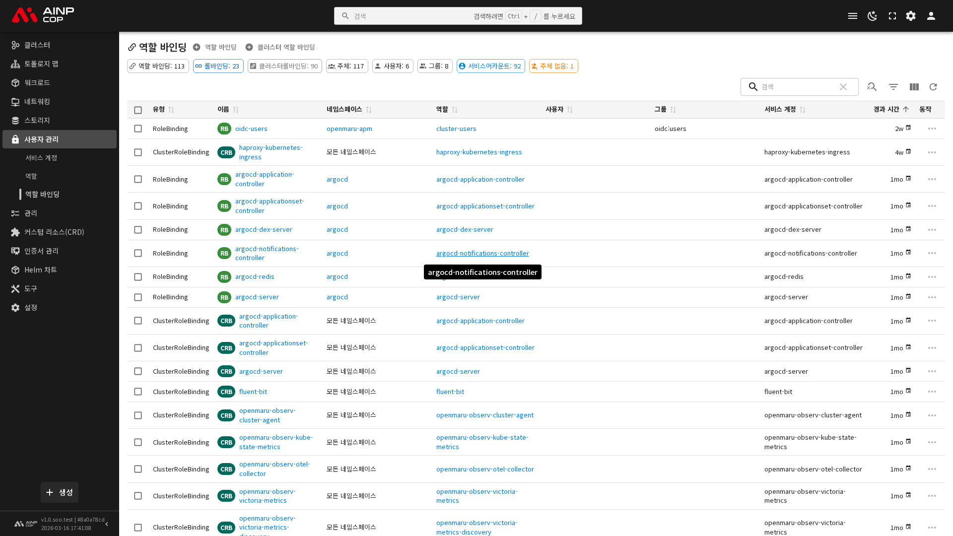 사이드바에서 보안 > 역할 바인딩을 선택하면 현재 네임스페이스의 RoleBinding 목록이, 보안 > 클러스터 역할 바인딩을 선택하면 ClusterRoleBinding 목록이 표시됩니다.
