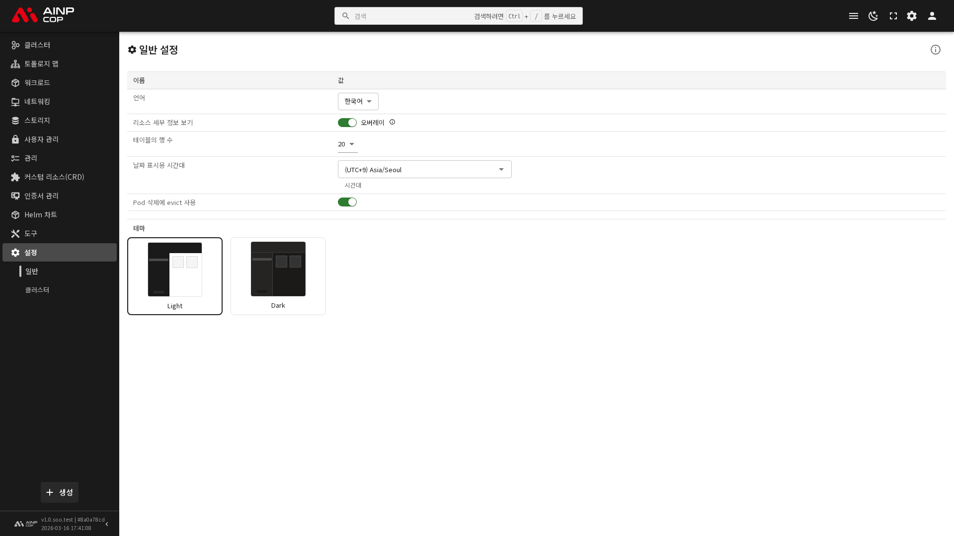 일반 설정에서는 콘솔의 전반적인 외관과 동작 방식을 변경합니다. 이 설정은 브라우저의 로컬 스토리지에 저장되며, 사용 중인 브라우저에서만 적용됩니다.