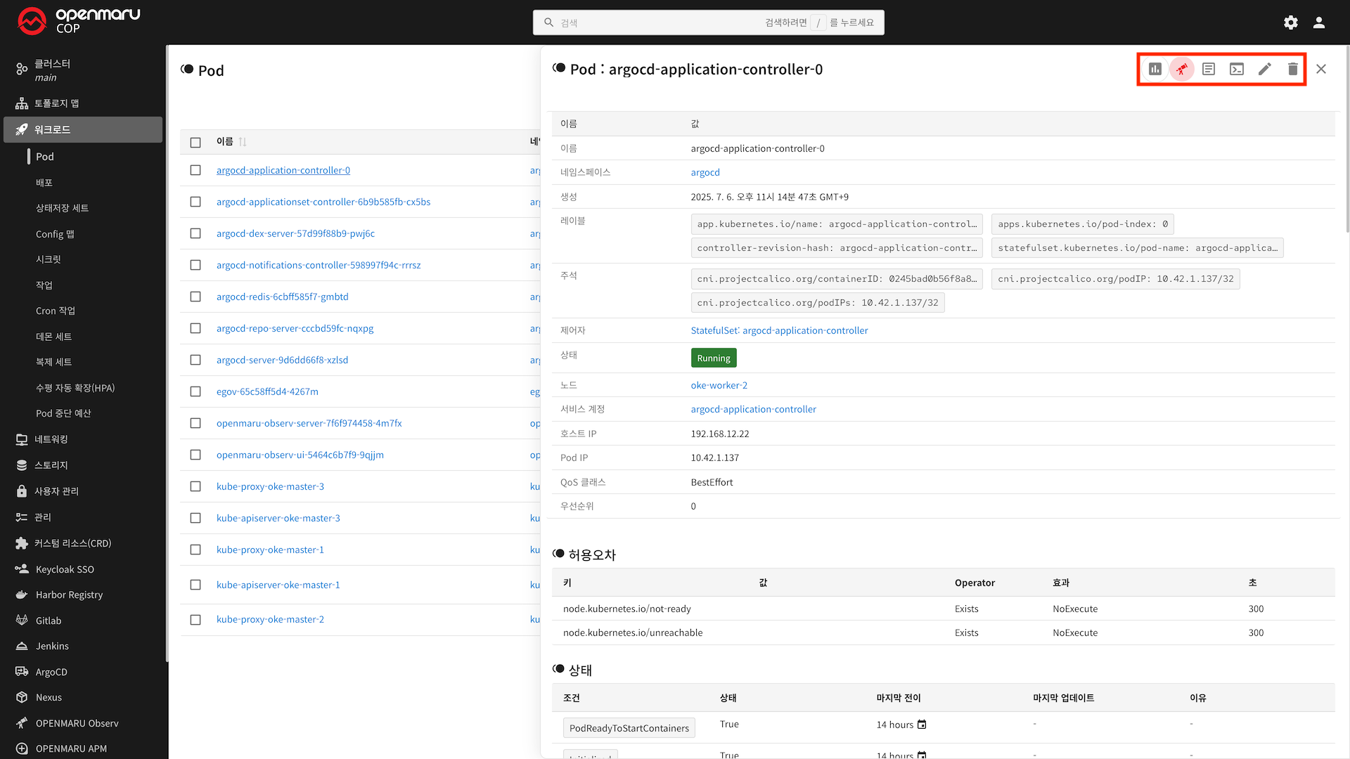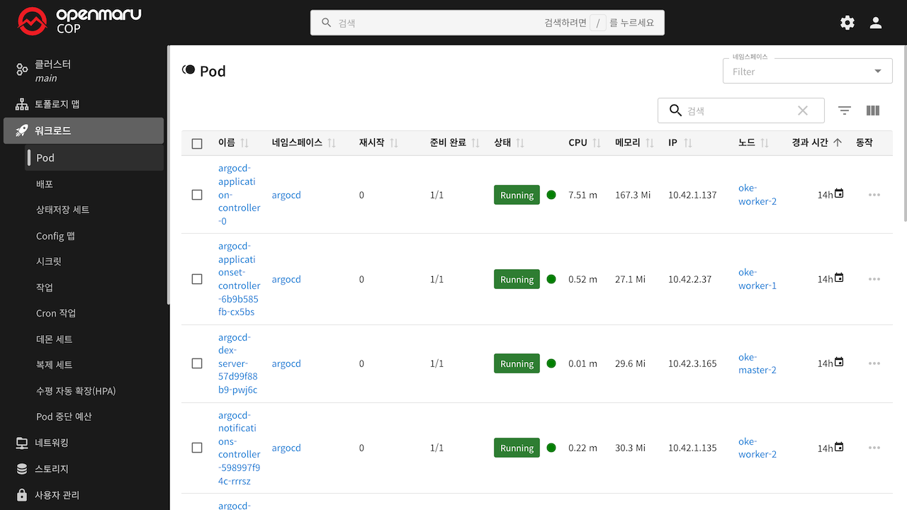 COP 콘솔의 '파드(Pod)' 메뉴에서는 쿠버네티스에서 생성하고 관리할 수 있는 가장 작은 배포 단위인 파드의 현황을 관리합니다. 파드는 하나 이상의 컨테이너 그룹을 나타내며, 클러스터에서 실행 중인 프로세스를 의미합니다. 이 메뉴를 통해 각 파드의 상태, 리소스 사용량, 로그 등을 확인하고 직접 제어할 수 있습니다.