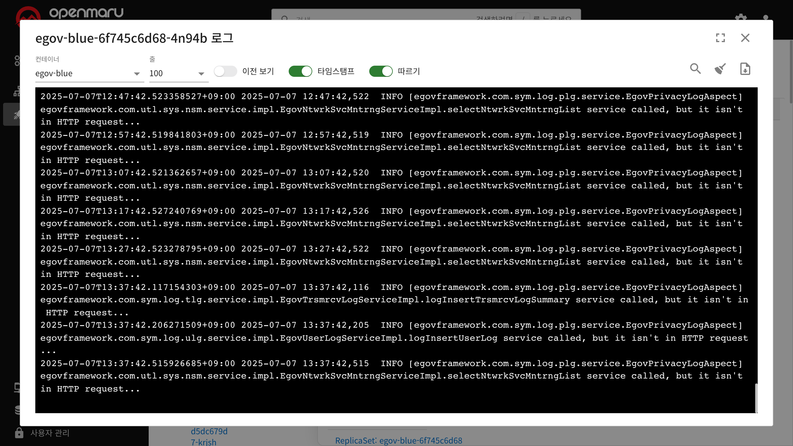 로그 보기 창에서는 컨테이너의 표준 출력(stdout) 및 표준 에러(stderr) 로그를 실시간으로 확인할 수 있습니다. 상단의 옵션을 통해 특정 컨테이너를 선택하거나, 타임스탬프 표시, 이전 로그 보기 등의 기능을 사용하여 애플리케이션의 동작을 디버깅할 수 있습니다. 로그를 텍스트로 다운로드 할수 있습니다.