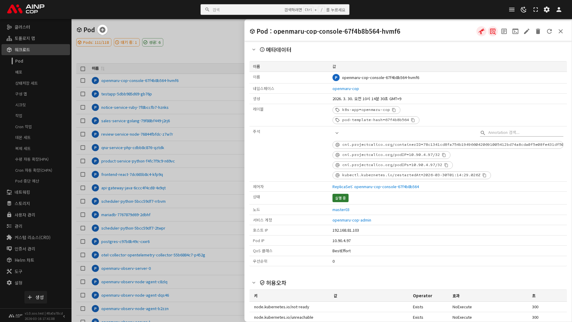 COP 사용자 가이드워크로드Pod이 페이지에서Pod COP 콘솔의 'Pod' 메뉴에서는 쿠버네티스에서 생성하고 관리할 수 있는 가장 작은 배포 단위인 파드의 현황을 관리합니다. 파드는 하나 이상의 컨테이너 그룹을 나타내며, 클러스터에서 실행 중인 프로세스를 의미합니다.