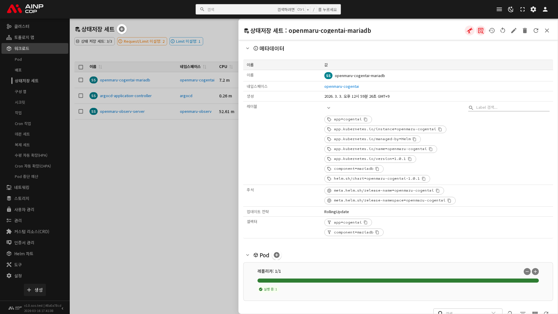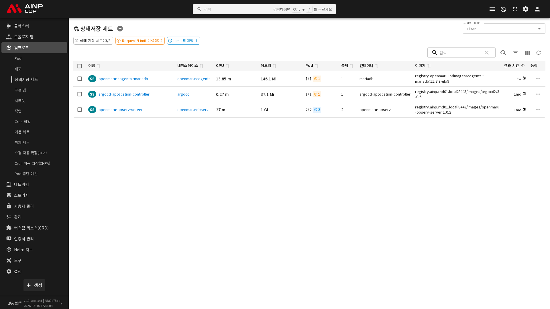 COP 콘솔의 '상태저장 세트(StatefulSet)' 메뉴에서는 안정적인 네트워크 식별자와 영구 스토리지가 필요한 상태 저장 애플리케이션을 관리합니다. 데이터베이스, 메시지 큐 등 상태를 유지해야 하는 워크로드를 배포하고 모니터링할 수 있습니다.
