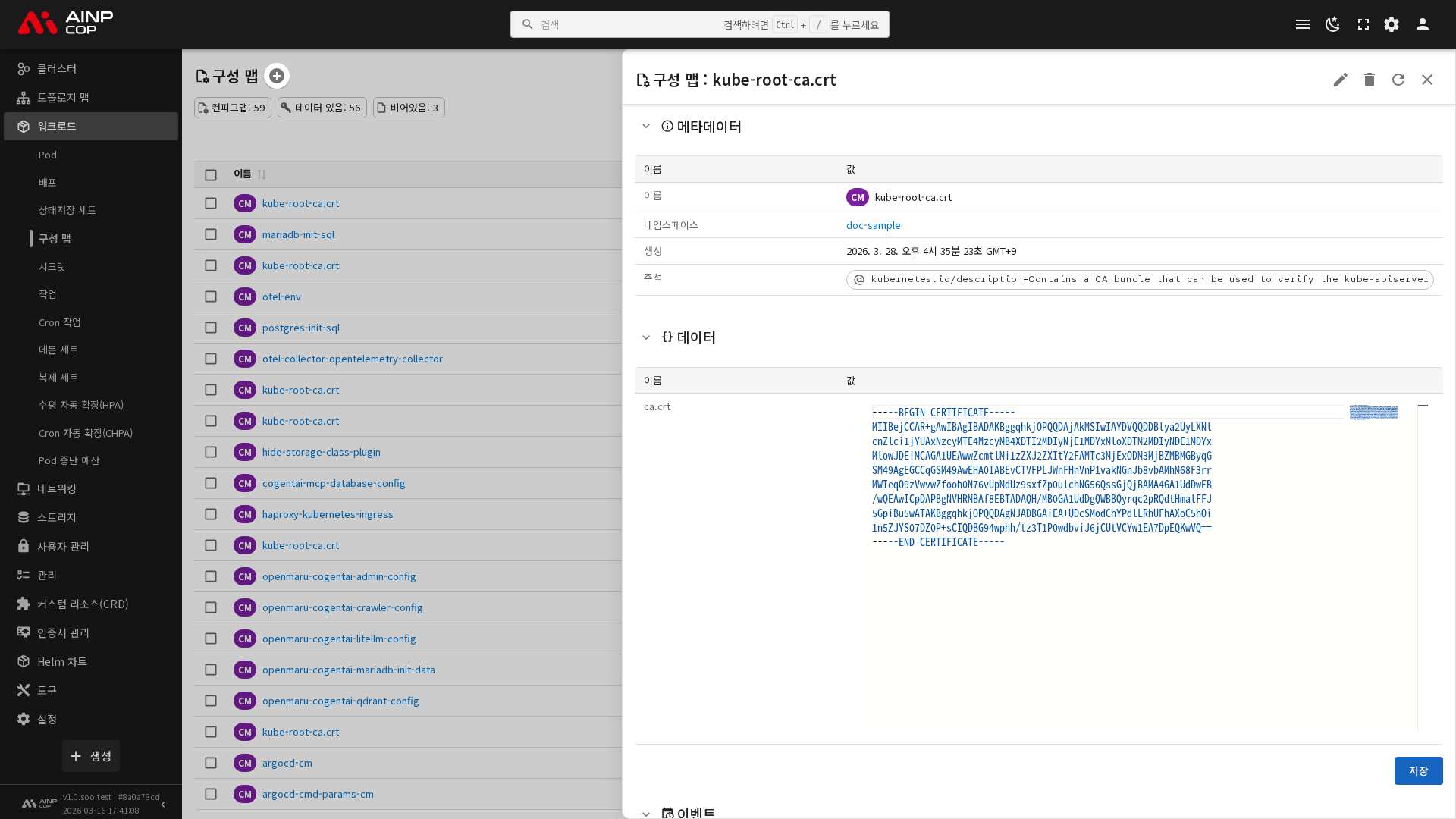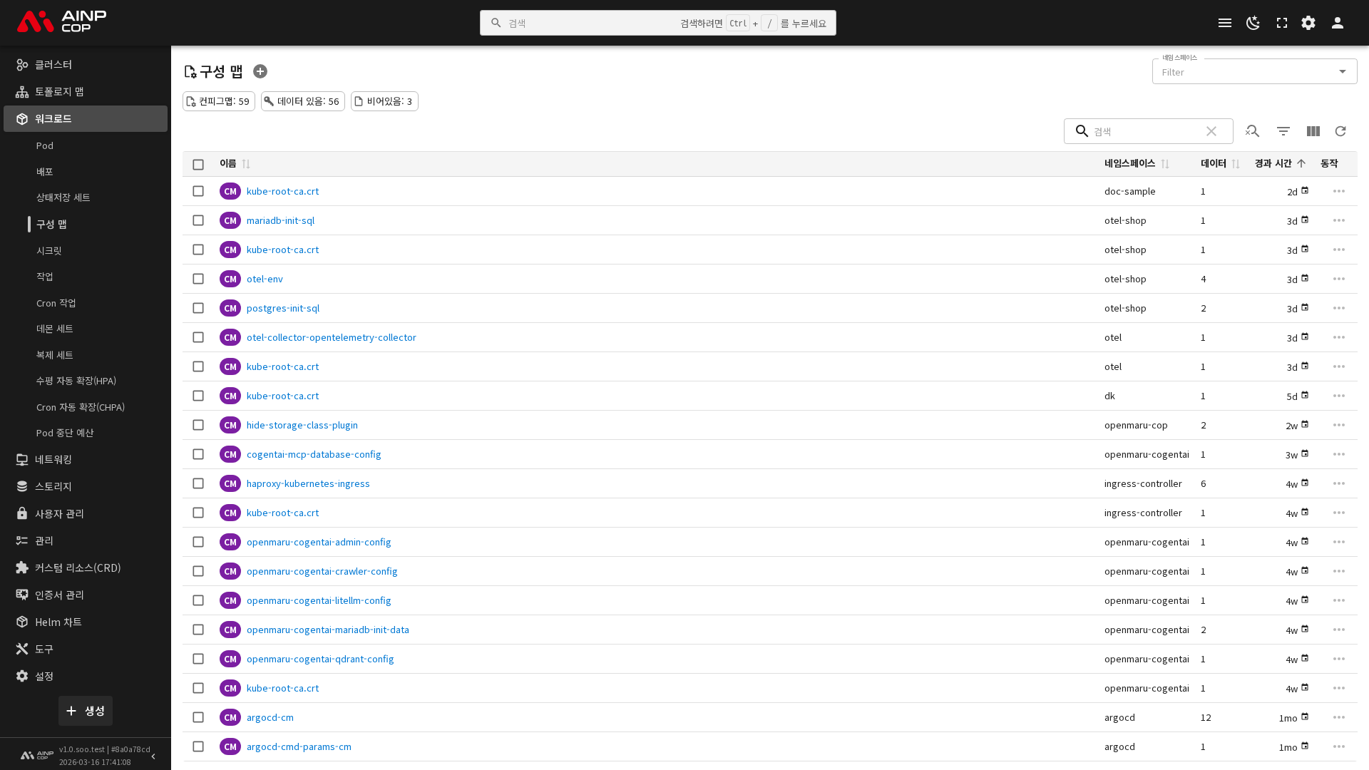 클러스터에 생성된 Config 맵의 정보가 목록 형태로 표시됩니다.