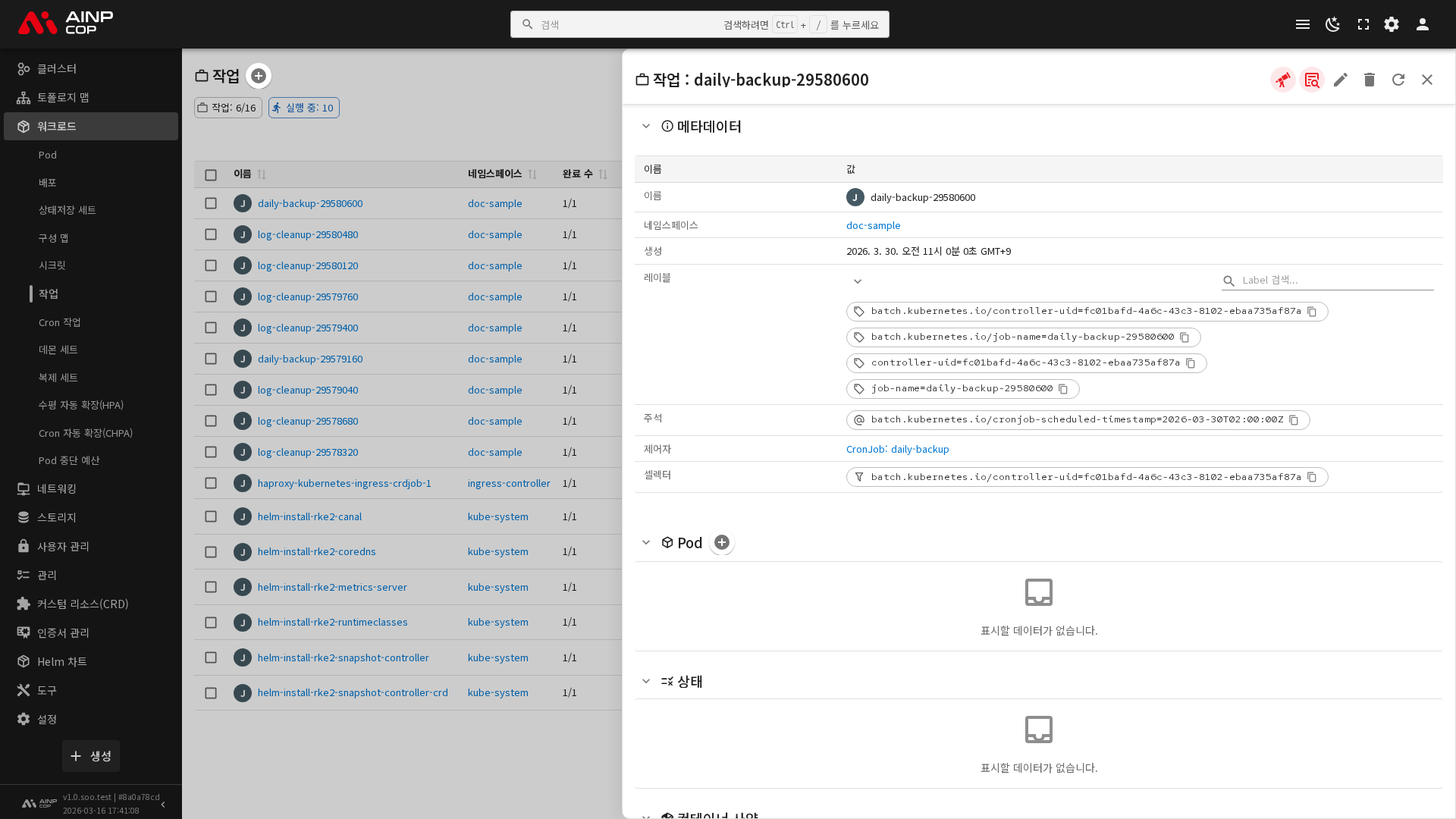 COP 콘솔의 '작업(Job)' 메뉴에서는 하나 이상의 파드를 생성하여 지정된 수의 파드가 성공적으로 완료되도록 보장하는 워크로드를 관리합니다. 작업은 배치 처리, 데이터베이스 마이그레이션 등 한 번 실행되고 종료되는 태스크를 수행하는 데 유용합니다.