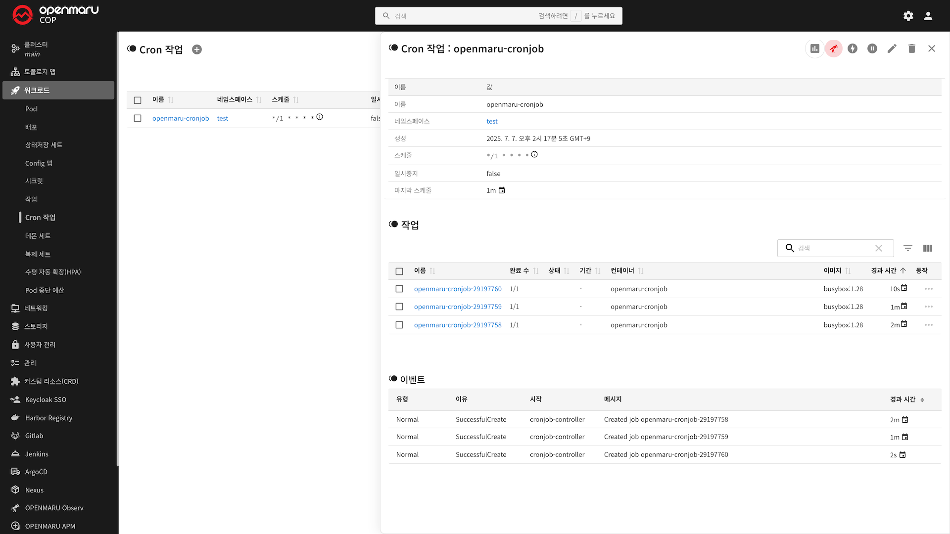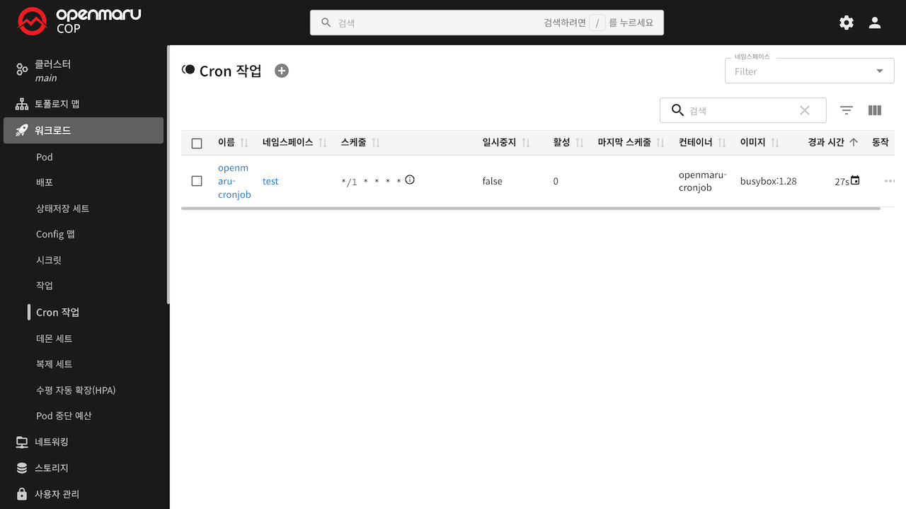 COP 콘솔의 'Cron 작업(CronJob)' 메뉴에서는 지정된 스케줄에 따라 주기적으로 작업을 실행하는 워크로드를 관리합니다. Cron 작업은 리눅스의 cron과 유사하게 동작하며, 데이터 백업, 리포트 생성, 이메일 발송 등 반복적인 태스크를 자동화하는 데 사용됩니다.