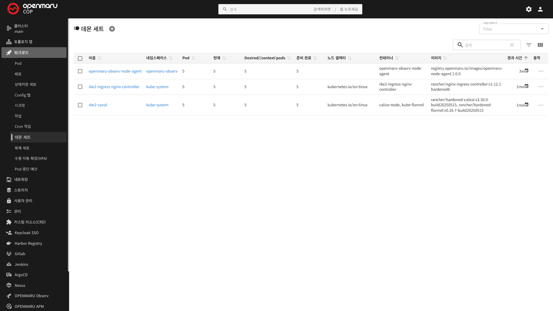 COP 콘솔의 '데몬 세트(DaemonSet)' 메뉴에서는 클러스터의 모든 또는 특정 노드에 항상 파드의 복제본이 실행되도록 보장하는 워크로드를 관리합니다. 데몬 세트는 로그 수집기, 노드 모니터링 에이전트와 같이 모든 노드에서 실행되어야 하는 클러스터 수준의 서비스를 배포하는 데 주로 사용됩니다.