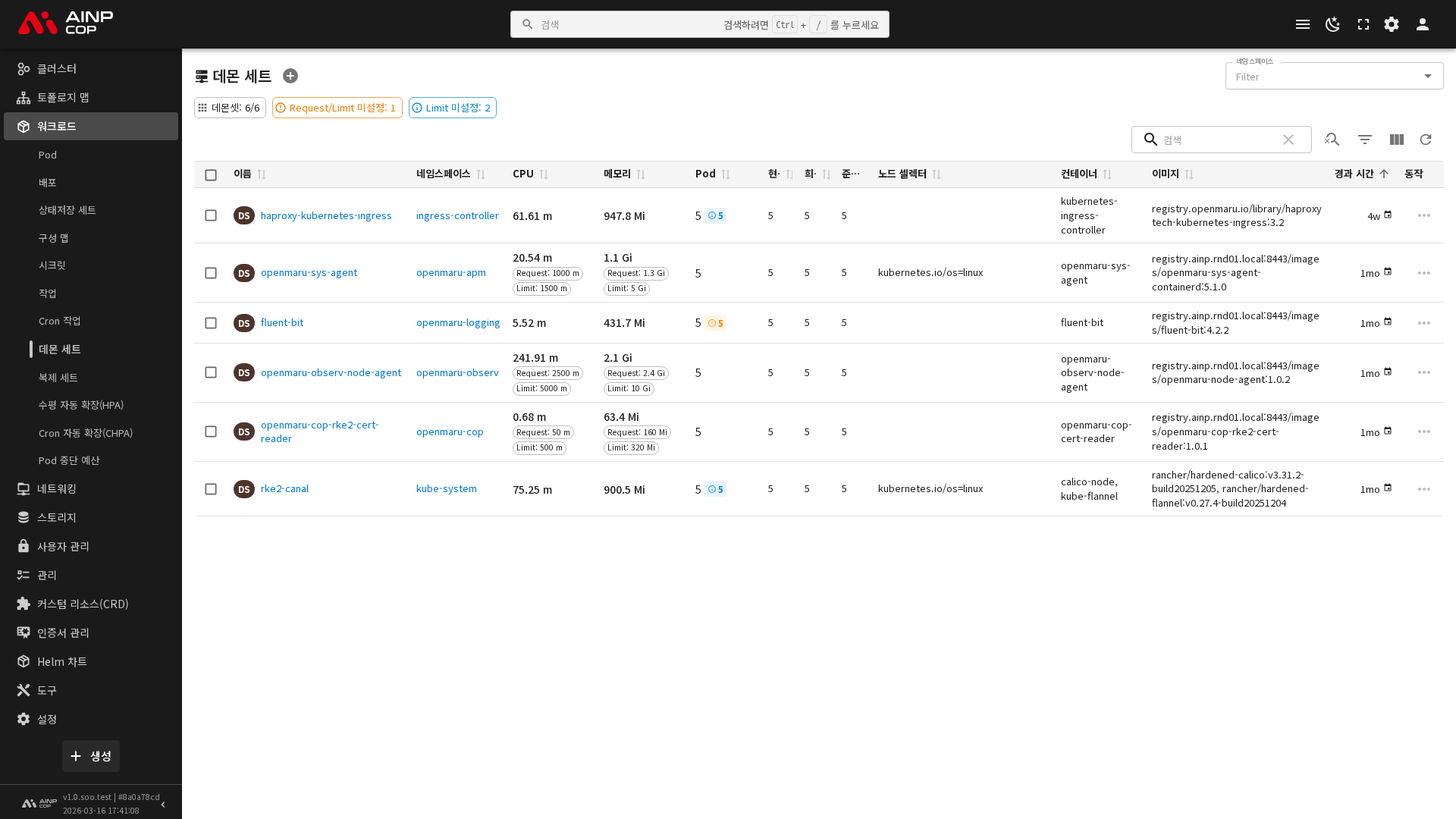 클러스터에 배포된 데몬 세트의 정보가 목록 형태로 표시됩니다.
