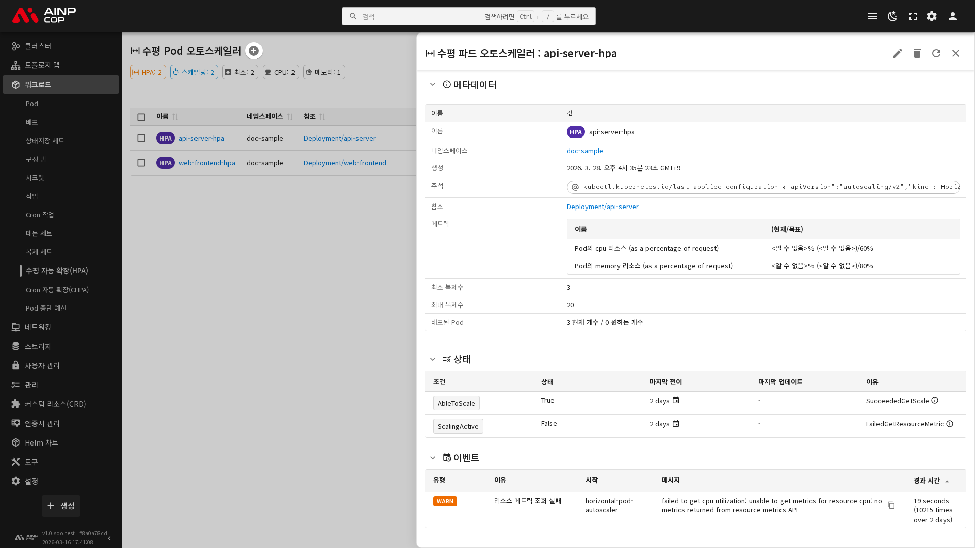 클러스터에 설정된 HPA의 정보가 목록 형태로 표시됩니다.
