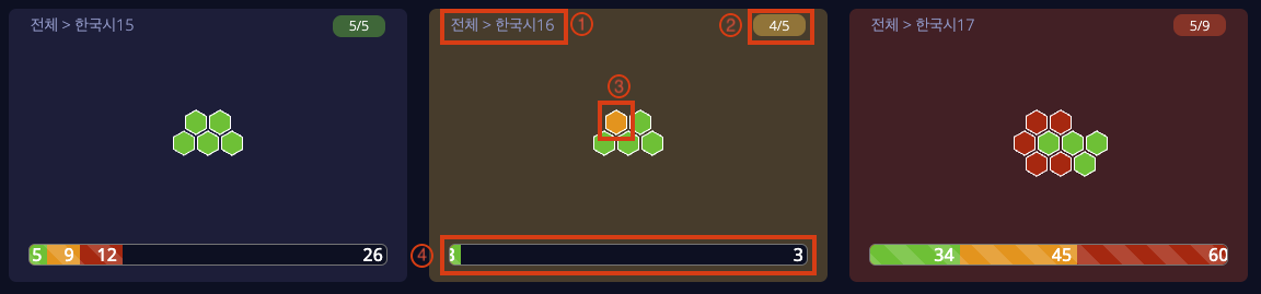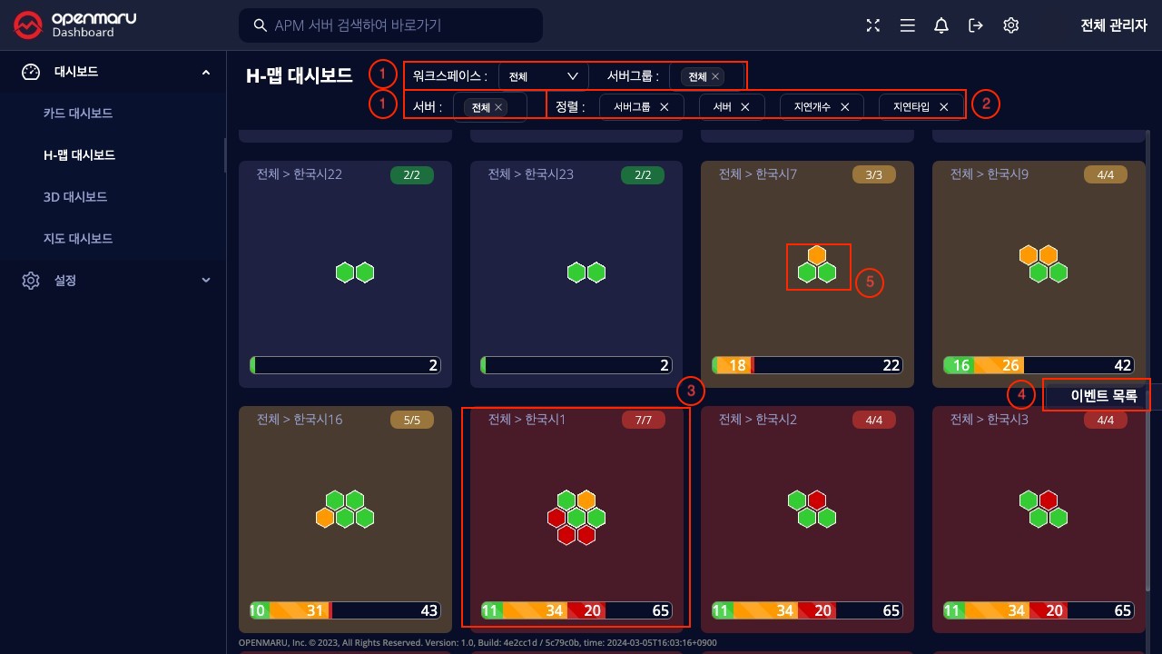 ② 실행중인 서버 그룹 개수 : 정상 상태인 육각형 개수 / 전체 개수